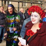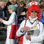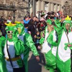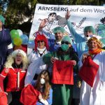Gegen 14.30 Uhr muss­te der Zug für eine Vier­tel­stun­de stop­pen. Auf der Trep­pe des Land­ge­richts gab es einen inter­nis­ti­schen Not­fall. Mit Hil­fe des Not­arz­tes kam der Betrof­fe­ne aber schnell wie­der auf die Bei­ne und der Zug setz­te sei­nen Weg durch die engen Spa­lie­re fort. Ganz oben thron­te Prinz Alex­an­der, der jecke Schüt­ze. Aber auch das Arns­ber­ger Kin­der­prin­zen­paar, das Hüs­te­ner Prin­zen­paar und die Nehei­mer Kin­der­prin­zes­sin sowie vie­le ehe­ma­li­ge Regen­ten  lie­ßen sich fei­ern. Grund zum Fei­ern hat­te auch der Freun­des­kreis V. Kom­pa­nie, der mit sei­ner 22. Zug­teil­nah­me ein kar­ne­va­lis­ti­sches Jubi­lä­um fei­er­te. Mit rund 50 grün­kos­tü­mier­ten Frö­schen for­der­te die Fünf­te, die Krö­ten­wan­de­rung in den Online­han­del zu stop­pen. Opti­mis­mus, dass es mit dem Pati­en­ten Arns­berg wie­der auf­wärts geht, zeig­ten die Ärz­te und Schwes­tern von „Wir in Arns­berg“. Mit gro­ßen Grup­pen erin­ner­ten der TVA an den Bau sei­nes Sport­zen­trums und der Kneipp­ver­ein an das Team Arnsberg/Storchennest. Ihre zehn­te Zug­teil­nah­me fei­er­ten die Königs­paa­re im Kom­mers­kreis mit Barock­kos­tü­men. Der Cari­tas­ver­band zeig­te sich mit einer gro­ßen Grup­pe „bunt wie eine Blu­men­wie­se“. Aus Nie­der­ei­mer kam die Affen­ban­de und aus Uen­trop erst­mals die Prin­zen­gar­de. Die Hei­lig­kreuz-Gemein­de mach­te die Kul­tur­stadt Arns­berg zum Broad­way und der Cock­tail­club Muf­fri­ka die Wen­ni­g­lo­her­stra­ße zur Sesam­stra­ße. Hof­staat und Blas­or­ches­ter der Bür­ger­schüt­zen, Jugend­rot­kreuz und Gym­na­si­um Lau­ren­ti­a­num, bun­te Pfau­en­power von „Nie kom­plett“ und Mas­ken­ma­gie von Blau­weiß Neheim, die Arns­ber­ger Grü­nen mit einem Plä­doy­er für ein bun­tes Arns­berg und Viel­falt in der Stadt und noch man­che mehr sorg­ten für ein eben­so far­ben­präch­ti­gen wie unter­halt­sa­men Zug. das Publi­kum jeden­falls hat­te sei­ne Freu­de und fei­er­te noch lan­ge in den Knei­pen weiter.