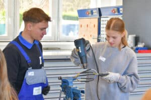 Zur Einführung lernten die jungen Menschen im Ausbildungszentrum zuerst das Unternehmen und anschließend die Tätigkeiten der Elektronikerin bzw. des Elektronikers für Betriebstechnik kennen. Unter Anleitung der Auszubildenden probierten sich die Teilnehmenden selbst aus. So führten sie beispielsweise Lötübungen durch, verdrahteten eine Ausschaltung und lernten, wie eine Muffe montiert wird.
