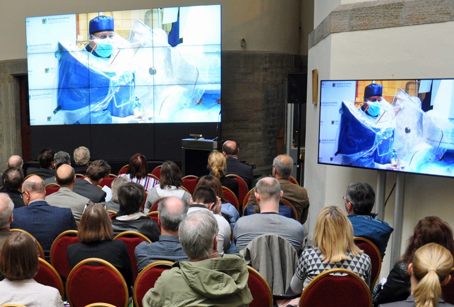 Geboten werden ihnen neben zahlreichen State-of-the-art-Vorträgen rund 20 „live“ über Satellit zugeschaltete Videoübertragungen von Gefäßeingriffen. Die Ärzte im Kongresszentrum können ihren mit minimalinvasiver Kathetertechnik operierenden Kollegen dann per Riesen-Video-Wand über die Schulter und auf die Finger schauen, Fragen stellen, Ratschläge geben und vor allem über das im jeweiligen Fall beste Behandlungsverfahren gemeinsam diskutieren. Der technische Aufwand dazu ist enorm. Für die Videoübertragungen sind allein zwei TV-Teams über drei Tage gleichzeitig im Außeneinsatz. Dr. Lichtenberg ist überzeugt, dass der Aufwand lohnt: „Es sind die Feinheiten im Umgang mit den neusten Techniken, die den Unterschied machen. Da hilft der genaue Blick auf die Arbeit der Kollegen und der fachübergreifende Austausch ungemein.“ Workshops und spezielle Simulatortrainings, in denen neuste Interventionsverfahren getestet und erlernt werden können, ein eigens und erstmals eingerichtetes Forum für Nachwuchsgefäßmediziner sowie ein Fortbildungstag für Fach-Assistenzpersonal in der Gefäßmedizin zählen ebenfalls zum Programm der kommenden Gefäßtage.