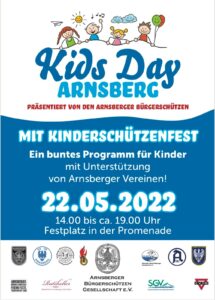 Arns­berg. Am Sonn­tag, 22. Mai 2022, fin­det der 2. Arns­ber­ger Kids Day am Fest­platz an der Pro­me­na­de statt. Einen gan­zen Nach­mit­tag lang, von 14 Uhr bis 19 Uhr, wird allen Kin­dern ein bun­tes Pro­gramm gebo­ten. Die Arns­ber­ger Bür­ger­schüt­zen prä­sen­tie­ren die­ses Kin­der­fest zum zwei­ten Mal nach 2019.