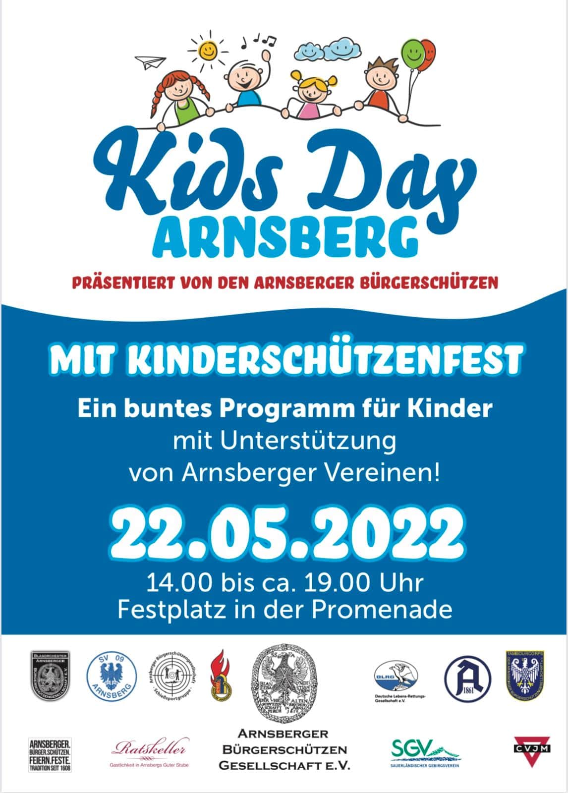Arns­berg. Am Sonn­tag, 22. Mai 2022, fin­det der 2. Arns­ber­ger Kids Day am Fest­platz an der Pro­me­na­de statt. Einen gan­zen Nach­mit­tag lang, von 14 Uhr bis 19 Uhr, wird allen Kin­dern ein bun­tes Pro­gramm gebo­ten. Die Arns­ber­ger Bür­ger­schüt­zen prä­sen­tie­ren die­ses Kin­der­fest zum zwei­ten Mal nach 2019.