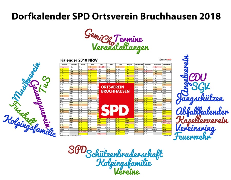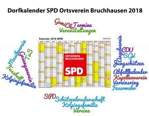 Bruchhausen. Zwischen den Jahren verteilen die Mitglieder des Vorstandes des SPD-Ortsvereins Bruchhausen zum 27. Mal wieder den Dorfkalender für Bruchhausen kostenlos an alle Haushalte in Bruchhausen. Neben den Terminen aller Bruchhausener Vereine, Parteien und anderen Gruppierungen sind auch wieder die Abfalltermine übersichtlich aufgeführt. Auch die NRW-Ferientermine und die Spieltage der Spiele der Deutschen Fußballnationalmannschaft bei der kommenden Weltmeisterschaft in Rußland sind eingestellt. Auch in der Dorfschänke Körner sowie in der Postagentur Bruchhausen liegen die Dorfkalender zur Mitnahme aus. Wer keinen Kalender erhält, kann sich gerne an die Mitglieder des Vorstandes wenden (Tel. 02932 429542). Der Kalender wird dann umgehend vorbei gebracht.