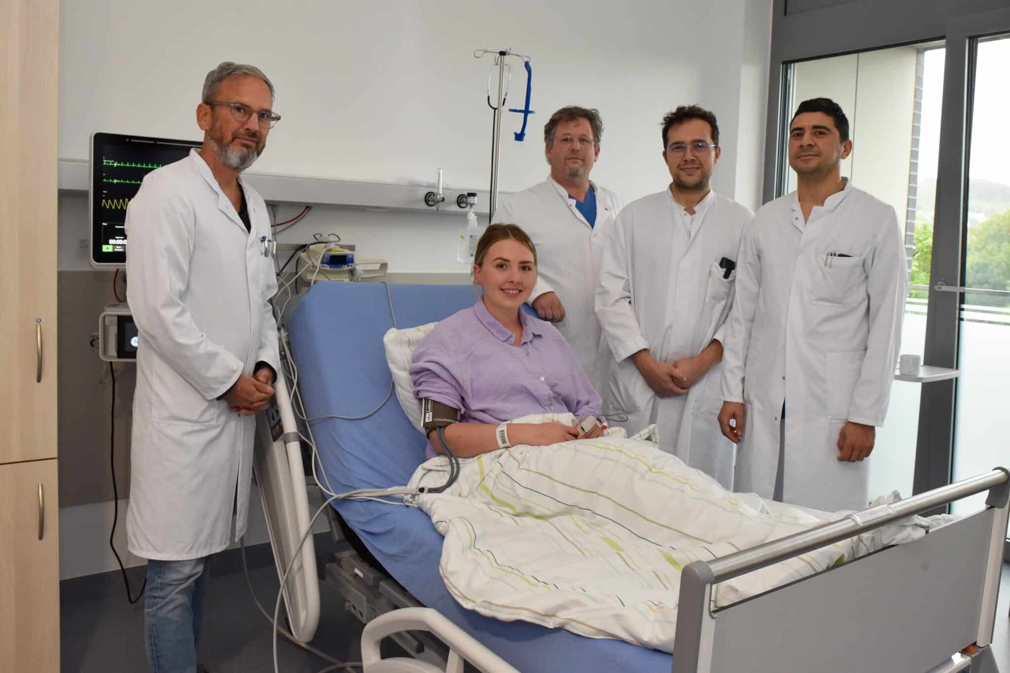 Die herbeigerufenen Notfallsanitäter haben die Patientin sofort zur Zentralen Notaufnahme in das Alexianer Klinikum Hochsauerland nach Hüsten gebracht. Etwa 30 Minuten dauerte die Fahrt zum Notfall- und Intensivzentrum, wo die Patientin vom bereits informierten Facharzt aus der Neurologie erwartet wurde, der die ersten Untersuchungen vornahm. Aufgrund der Tatsache, dass die junge Frau ein sechsmonatiges Kind stillt, wurde entschieden, zunächst keine Diagnose über einen Computertomographen (CT) mit Kontrastmittel zu veranlassen Zusammen mit Emre Ökeer, Oberarzt in der Klinik für Interventionelle Radiologie und Neuroradiologie, wurde die radiologische Untersuchung der Patientin dann fortgesetzt.