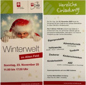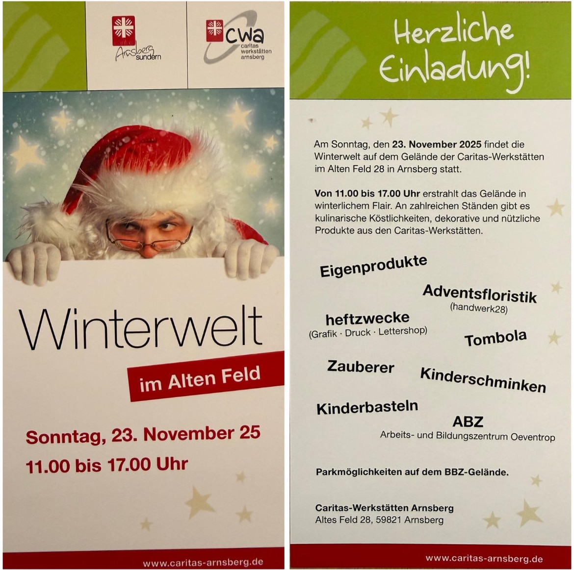 Arns­berg. Am Sonn­tag, den 23.11.2025 ist es soweit. In der Zeit von 11 – 17 Uhr prä­sen­tie­ren  sich die Cari­tas-Werk­stät­ten wie­der im Rah­men der „Win­ter­welt“.