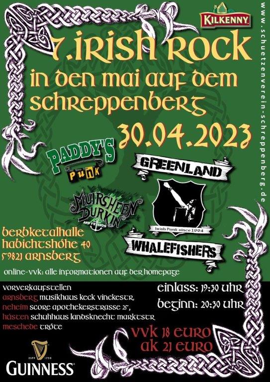 Arnsberg. In inzwischen gewohnter Manier begehen die Schreppenberger Schützen auch 2023 wieder den „Irish Rock in den Mai“. Bereits zum siebten Mal werden die Gäste eingeladen, ein Stückchen Irland mitten in Arnsberg zu erleben. Neben authentischen Getränken wie Kilkenny und Guinness vom Fass werden diverse Bands zuverlässig für ein erlebnisreichen Abend sorgen. Mit von der Partie sind die Irish Rock Urgesteine von „Muirsheen Durkin & Friends“ aus Arnsberg und Umgebung aber auch Neuzugänge wie die „Greenland Whalefishers“ aus Norwegen und „Paddys Punk“ aus Dessau/Leipzig. Mit kraftvollem Punkrock werden beide Bands den Schreppenberg zum Beben bringen.