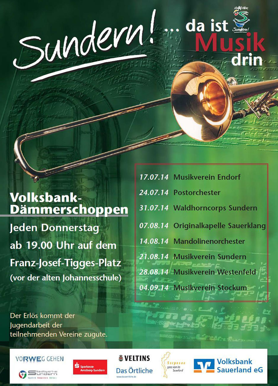 Sundern. Auch 2014 gibt es in Sundern wieder den Volksbank-Dämmerschoppen. Mit bis zu 200 Gästen pro Termin war die OpenAir Traditionsveranstaltung auf dem Franz-Josef-Tigges-Platz im letzten Jahr ein voller Erfolg. „Ein großer Dank geht vor allem an die ausgezeichneten und motivierten Musikkapellen,“ erklärt Jeroen Tepas von der Stadtmarketing Sundern eG und ergänzt: „Durch den Einsatz von Zelten konnte jeder Termin, bei gutem und vor allem aber auch bei schlechtem Wetter, durchgeführt werden.“