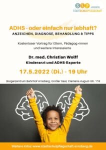 Unter dem Titel „ADHS – oder einfach nur lebhaft?“ wird es darum gehen, was die Aufmerksamkeitsdefizit-Hyperaktivitätsstörung überhaupt ist, welche Anzeichen darauf hindeuten können und wann Eltern dies medizinisch abklären lassen sollten. Dr. Wolff stellt Diagnoseverfahren und Behandlungsansätze vor und erklärt, in welchen Fällen die Gabe von Medikamenten sinnvoll sein kann. Nicht zuletzt erfahren Eltern, Pädagog*innen und alle Interessierten, wie sie den Alltag mit ADHS bestmöglich meistern und wie sie betroffene Kinder unterstützen können.
