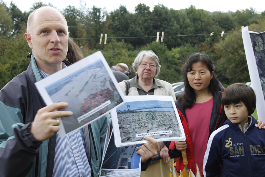 Einen ersten Eindruck vom prognostizierten Klimawandel und zur Erderwärmung vermittelte zu Beginn Dr. Mark Fleischhauer, der am Institut für Raumplanung der Technischen Universität Dortmund zum Thema „Stadt und Klimawandel“ forscht. Leicht verständlich für jung und alt zeigte er auf, warum die Auswirkungen des Klimawandels auch in der Stadtforschung eine gewichtige Rolle spielen. Im Interview mit Klimaschutzmanager Sebastian Marcel Witte, der auch durch den Tag führte, berichteten verschiedene Arnsberger über ihre Betroffenheit durch den Klimawandel. So berichteten Förster Stefan Fischer vom Wildwald Vosswinkel und Bernd Löhr, Wehrführer der Arnsberger Feuerwehr, von steigenden Waldbrandgefahren und Sturmereignissen, drohenden Überschwemmungen und Veränderungen in Flora und Fauna des Waldes. Die Rolle einer Ärztin und eines Gemüsehändler übernahmen dann die städtischen Praktikanten Lisa Storm sowie Christian Heimann, die beide auch im Vorfeld die Veranstaltung vorbereitet hatten. Sie berichteten beispielsweise von veränderten Vegetationsperioden, neuen Krankheitsbildern und Schädlingsarten oder den Gesundheitsgefahren durch extreme Hitzereignisse.