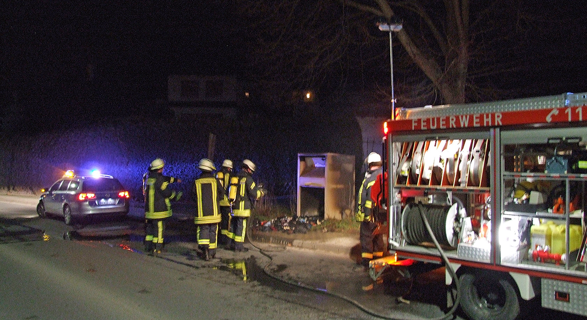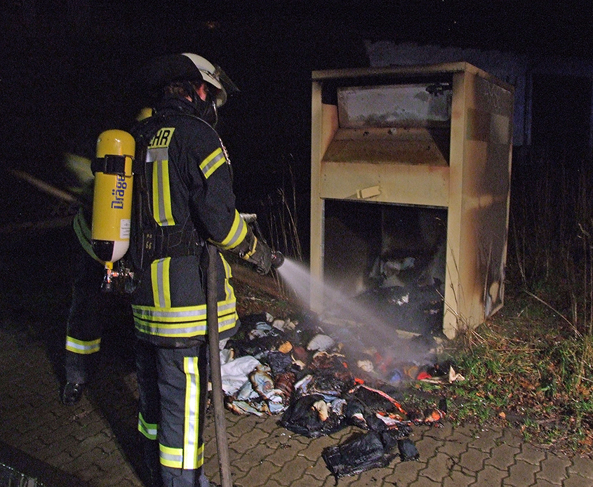 Unter schwerem Atemschutz öffneten die Einsatzkräfte die vordere Klappe des Containers und löschten den Inhalt ab. Die Kleidungsstücke wurden aus dem Container auf den Gehweg ausgebreitet, damit sichergestellt werden konnte, dass der Inhalt vollständig abgelöscht war. Während der Löscharbeiten musste die Amecker Straße im Bereich der Einsatzstelle einspurig gesperrt werden. Verletzt wurde niemand. Die Einsatzstelle wurde abschließend an die Polizei übergeben. Gegen 19 Uhr waren die Einsatzkräfte wieder zurück am Gerätehaus. Zur Ursache des Brandes konnten keine Angaben gemacht werden.