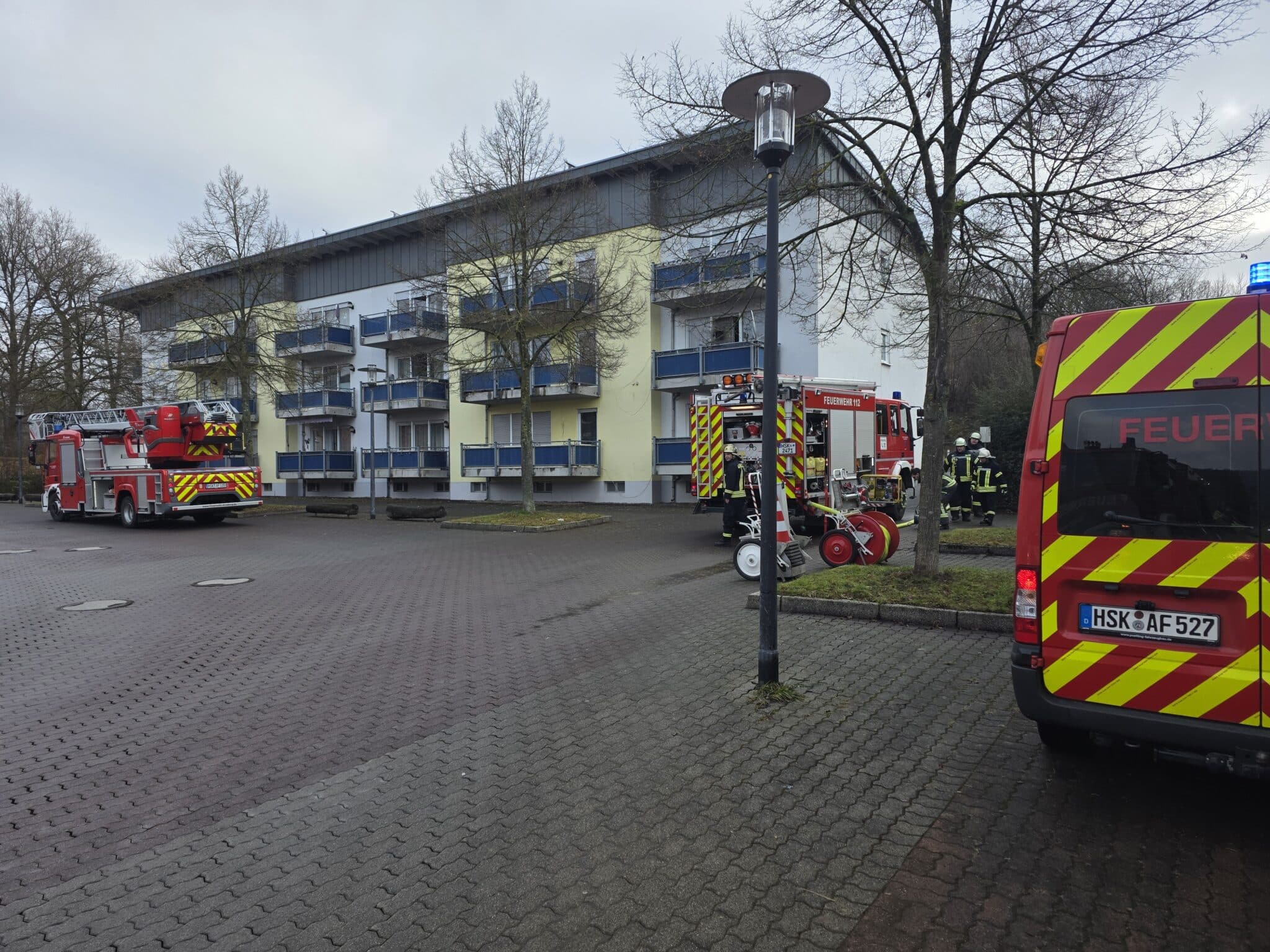 Während der Aufräumarbeiten kam es zu einem weiteren Einsatz: Die zunächst bereitgestellte Drehleiter wurde in der Anton-Cöppicus-Straße nicht mehr benötigt und rückte zu einem Paralleleinsatz nach Hüsten ab. Dort unterstützte die Drehleiter den Rettungsdienst dabei, einen Patienten aus einem Wohnhaus zu retten.