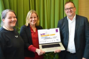 Eka­te­ri­na Seni­na von der Hoch­schu­le Hamm-Lipp­stadt, Saskia Haardt-Cerff von der Arbeit­ge­ber­schmie­de Süd­west­fa­len und Andre­as Schrol­ler von der agen­tur mark (v.l.) laden zum 3. Co-Crea­ti­on-Camp ein. (Foto: B.Sander-Graetz/Südwestfalen Agen­tur GmbH)