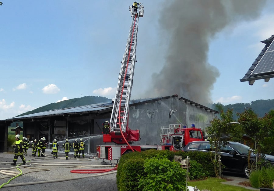 Am Freitag gegen 11.40 Uhr wurden die Löschgruppen aus Altenhellefeld, Hellefeld, Linnepe und Westenfeld sowie der Löschzug aus Sundern zum Brand eines landwirtschaftlichen Betriebes in Altenhellefeld alarmiert (wir berichteten bereits). Beim Eintreffen der ersten Einsatzkräfte stand ein Gebäude bereits im Vollbrand, das als Garage für landwirtschaftliche Fahrzeuge und Maschinen sowie als Werkstatt diente. Auf dem Gebäude befand sich eine Photovoltaikanlage. Umgehend wurde eine massive Brandbekämpfung eingeleitet, wodurch das Übergreifen auf umliegende Gebäude verhindert werden konnte. Nach rund zwei Stunden war das Feuer unter Kontrolle. Die Nachlöscharbeiten zogen sich bis in den Nachmittag hin. Bei den Löscharbeiten verletzte sich ein Feuerwehrangehöriger leicht und musste ins Krankenhaus eingeliefert werden. Zur Brandursache hat die Polizei die Ermittlungen aufgenommen. Aufgrund des hohen Gebäudeschadens und der Zerstörung mehrerer landwirtschaftlicher Maschinen und Geräte schätzt die Polizei den Gesamtschaden nach derzeitigem Stand auf einen mittleren sechsstelligen Betrag.