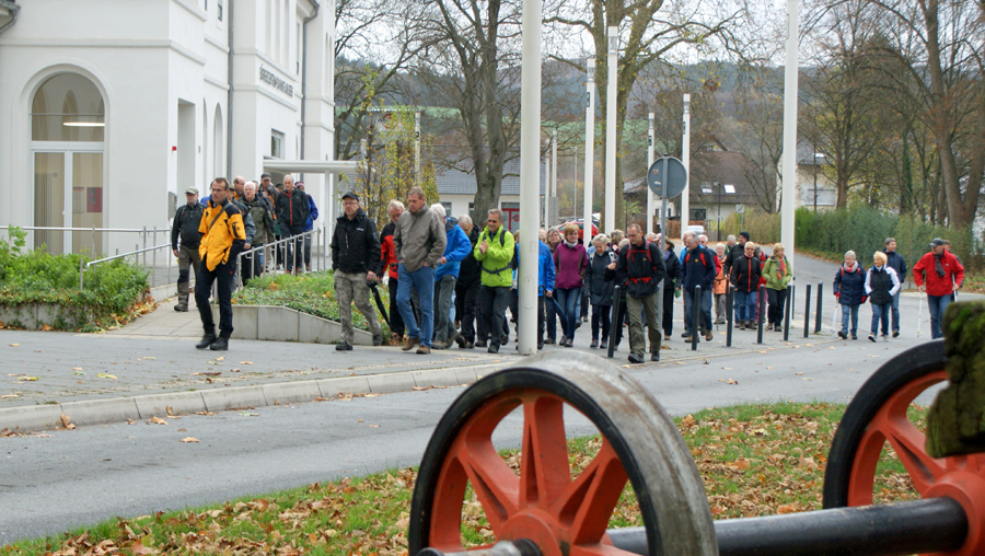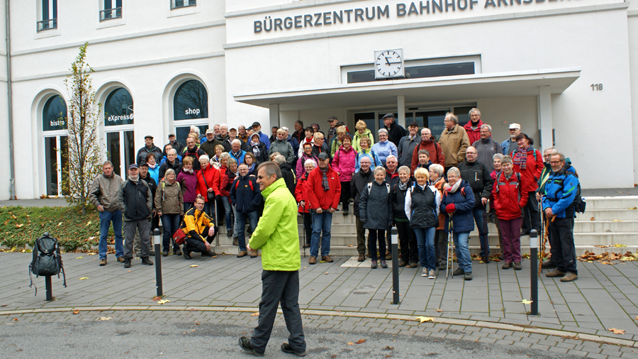 Die Wanderung verlief durch die Altstadt, Jägerbrücke, Obereimer, und über den Ruhrtalradweg zunächst bis Niedereimer. Nach einer kurzen Pause übernahm ein Wanderführer der einladenden Abteilung, Reinhard Hültenschmidt. Er leitete die erwartungsvollen Wanderer durch Bruchhausener Wohngebiete und über Waldwege bis zum gastlich hergerichteten SGV-Heim. Detlef Herbst begrüßte hier offiziell die inzwischen auf etwa 110 Gäste „angewachsene“ Schar und zeigte sich dabei begeistert. Den „hungrigen Mäulern und durstigen Kehlen“ wünscht er schließlich schöne Stunden im SGV-Heim, in dem sich seine Mannschaft auf alle Annehmlichkeiten vorbereite hatte. Nicht nur Kaffee und selbstgebackene Torten verwöhnten die Anwesenden, sondern auch „Entenburger“ und reichlich passende Getränke. Heizpilze im angebauten Partyzelt, sowie Klatsch und Tratsch mit inzwischen bekannten Mitwanderern aus jedem Winkel Arnsbergs trugen zur Gemütlichkeit bei. Feiermusik aus Lautsprechern und – ganz besonders – die „Stimmungsmache“ durch Wilhelm Wilmes mit seinem Akkordeon, ebenfalls Mitglied der SGV-Abteilung Bruchhausen, brachten die Gäste dann auf Hochtouren. Im Vereinsheim der Bruchhausener SGV-er „steppte der Bär und rockte die Ente“ bis in die dunklen Abendstunden.