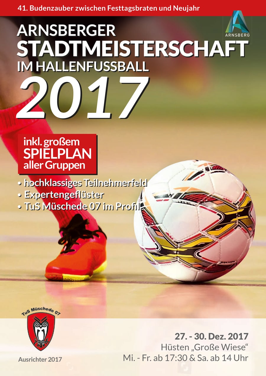 Müschede/Hüsten. Zwischen Festtagsbraten und Neujahr ist es wieder soweit. Die 41. Arnsberger Stadtmeisterschaften im Hallenfußball werfen ihren Schatten voraus. Der TuS Müschede als diesjähriger Ausrichter lädt alle Sportfreunde aus Arnsberg und Umgebung zum jährlichen Highlight im Hallenfußball ab Mittwoch, 27. Dezember in die Sporthalle „Große Wiese“ nach Hüsten.