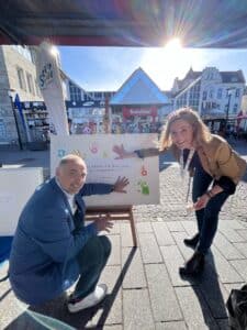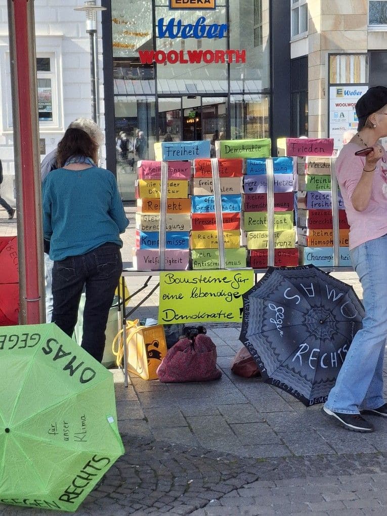 Als einer der Höhepunkte wurde der 21. März als „Internationaler Tag gegen Rassismus“ in Neheim mit unterschiedlichen Aktionen gefeiert. Initiativen und Einrichtungen präsentierten ihr Engagement für Demokratie an Informations- und Aktionsständen. Vielfältige Aktionen luden zum kreativen Mitmachen ein. So konnten die Besucher:innen am Stand der Stadtschulpflegschaft und des Stadtelternbeirates auf Tafeln ihre „Handabdrücke für Demokratie“ zu einzelnen Artikel des Grundgesetztes hinterlassen. Die Fußgängerzone verwandelte sich so in eine „Hauptstraße der Vielfalt und Demokratie“. Neben einer Foto-Galerie als „Wäscheleinen-Aktion“ entlang der Fußgängerzone zu insgesamt 14 Demokratieprojekten, stellen Schüler:innen der Grundschule „Rote Schule“ und der Agnes-Wenke-Schule ihre Werte der Demokratie vor.