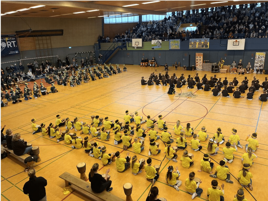 Auch Schulen, Jugendeinrichtungen sowie weitere zivilgesellschaftliche Organisationen und Initiativen beteiligten sich mit ihren Projekten und setzten damit ein starkes Zeichen für Respekt, Verantwortung und Wertschätzung. Die Aufführungen von Schulen füllten Sport‑, Schützenhallen sowie Schulhöfe mit bis zu 600 Besucher:innen. So begeisterten die Kinder der Johannesschule mit ihrer Aufführung „Das Geheimnis der Zaubertrommel“ rund 500 Besucher:innen. In der Projektwoche wurden zudem zu den Themen Rassismus, Afrika und Umweltschutz gearbeitet. „Ein rundum gelungenes Projekt, das durch Musik, Bewegung und Theater Kulturen sowie Jung und Alt miteinander verbindet und stolz sein lässt auf das, was man gemeinsam geschafft hat. Es war ein sehr bereicherndes Erlebnis, die Fähigkeiten und Neigungen der Kinder beobachten zu können“, bewertet Schulleiterin Marion Beine.