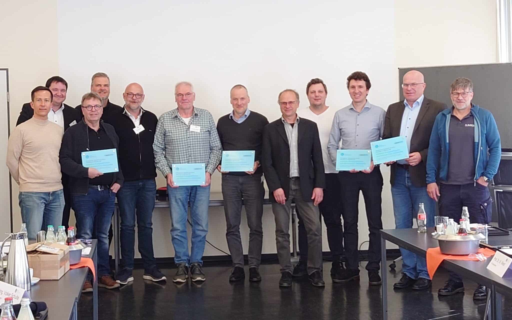 Aufgrund der positiven Erfahrungen in der vergangenen dreijährigen Projektlaufzeit, haben sich die Mitglieder für eine Fortführung entschieden, die im zweiten Teil der Veranstaltung geplant wurde. Prof. Dr. Wolfgang Wiest von der FH Südwestfalen moderierte den Austausch und sammelte die Ideen der Anwesenden. So soll es bei den nächsten Treffen u.a. um den Einsatz Künstlicher Intelligenz in der Produktion, Veränderungen auf dem Strommarkt und Neuerungen, die mit der Novelle des Gebäudeenergiegesetzes auf die Industriebetriebe zukommen, gehen. Auch aktuelle Neuigkeiten aus der Fördermittellandschaft werden durch Vertreter der Effizienz-Agentur NRW regelmäßig auf der Agenda stehen. Zum Abschluss der Veranstaltung überreichte Oliver Dülme, Prokurist der Wirtschaftsförderungsgesellschaft HSK, die Plaketten der Initiative von Bundesregierung und Wirtschaft. Insgesamt haben die Mitglieder seit 2021 rund 42 Gigawattstunden an Energie und zwölf Kilotonnen an Treibhausgasen eingespart. „Das ist ein beachtlicher Erfolg, auf den Sie sehr stolz sein können“, so Oliver Dülme bei der Übergabe.