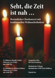 Arnsberg/Holzen. Die Weihnachtsmärkte haben wieder geöffnet und in wenigen Wochen steht das Weihnachtsfest vor der Tür. Davor darf natürlich das vorweihnachtliche Chorkonzert des gemischten Chores pro Vocal Arnsberg nicht fehlen. In diesem Jahr findet es am Mittwoch den 21. Dezember um 19 Uhr in der Kirche St. Johannes Ev. Holzen statt. Alle Besucher können sich bei freiem Eintritt mit alten deutschen Weihnachtsliedern in eine besinnliche Adventsstimmung versetzen lassen.