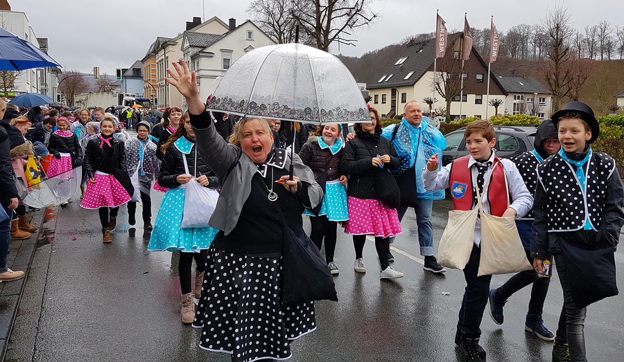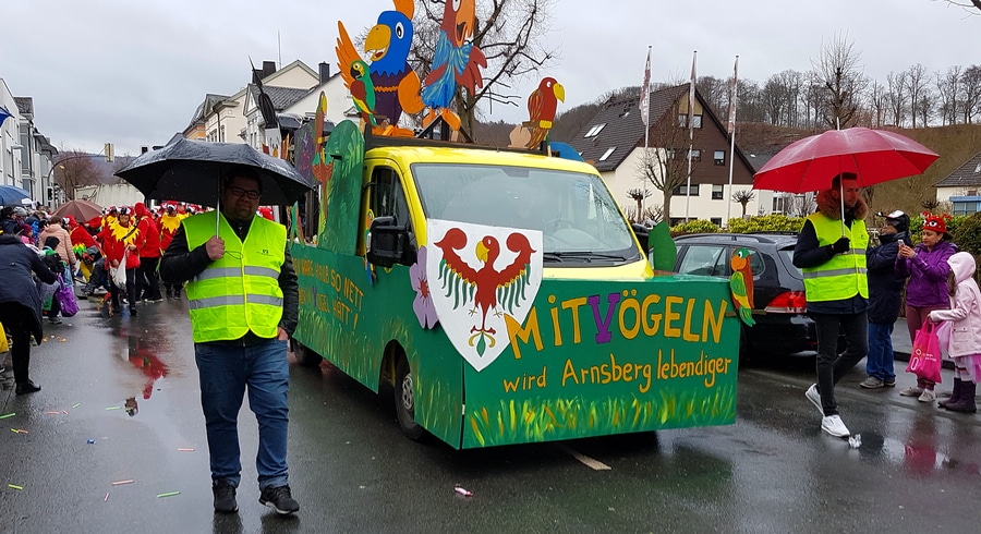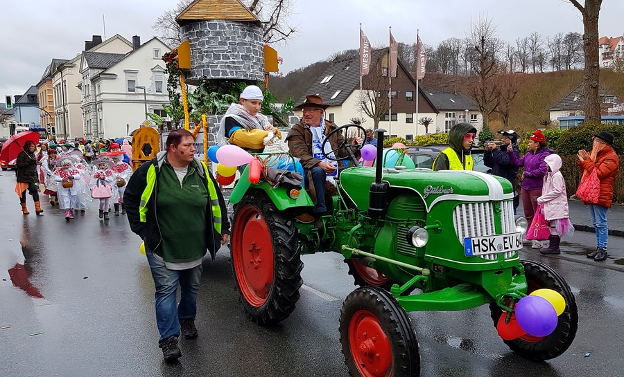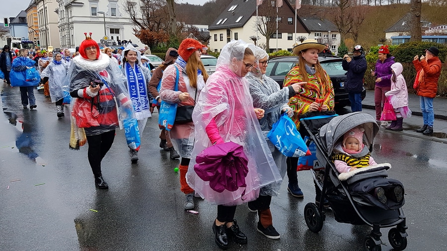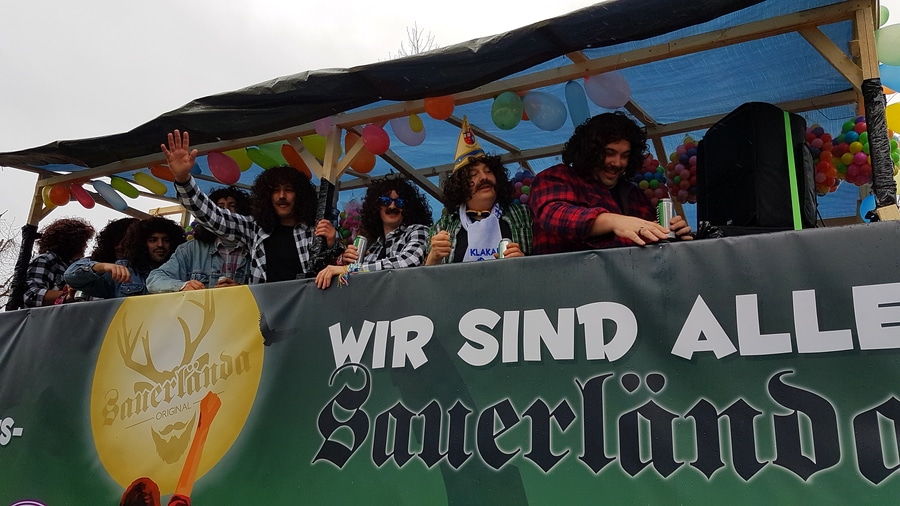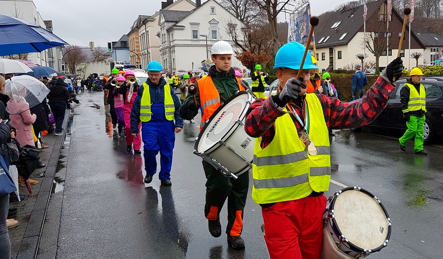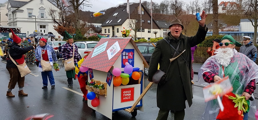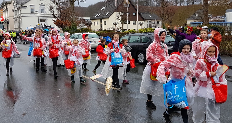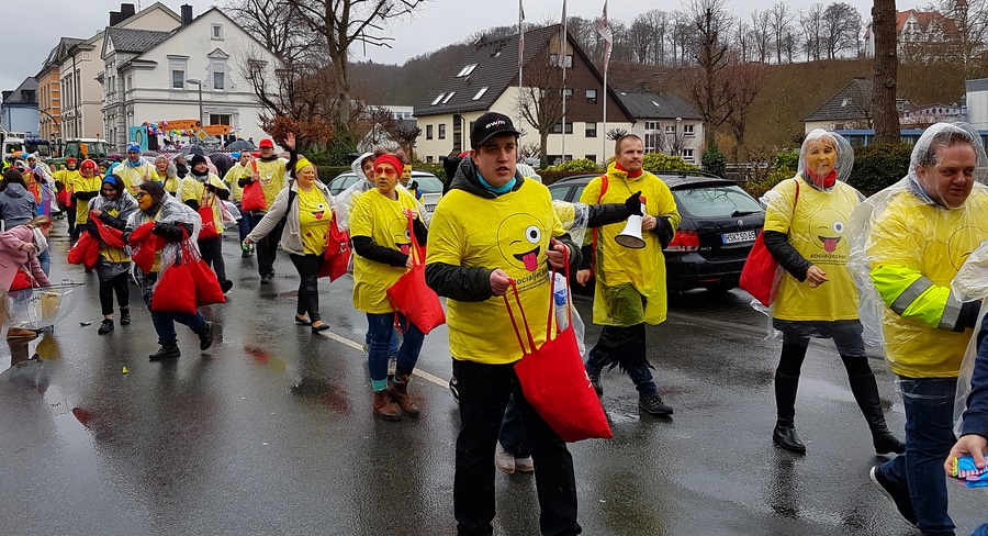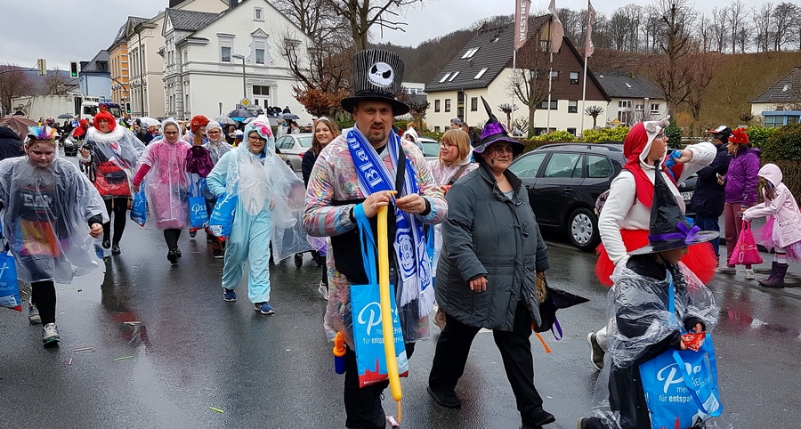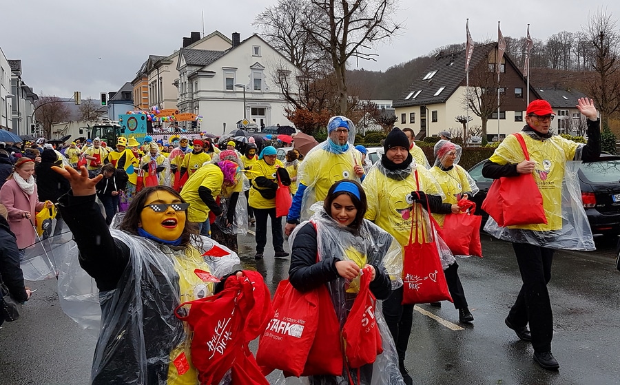 Arnsberg. Auch vom eher unfreundlichen Wetter mit Wind und Sprühregen ließen sich einige tausend Arnsberger und Gäste nicht von ihrem Besuch beim Arnsberger Karnevalssonntagszug abhalten. Auch hunderte von Aktiven hatten ihren Spaß im von der KLAKAG organisierten „Lindwurm der Freude“.