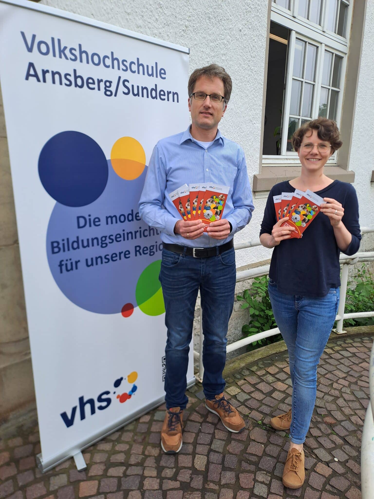 Dr. Tobi­as Schul­ter, Lei­ter der vhs Arnsberg/Sundern, und Dr. Cari­na Mid­del freu­en sich, dass mit dem neu­en Bil­dungs­ur­laubs-Pro­gramm eine alte Tra­di­ti­on der vhs Arnsberg/Sundern fort­ge­führt wird. Die neu­en Bro­schü­ren sind frisch ein­ge­trof­fen. (Foto: vhs Arnsberg/Sundern)