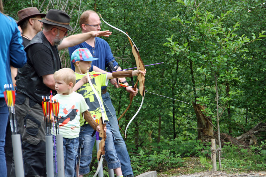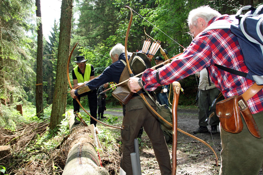 150 traditionelle Bogenschützen, darunter auch 20 Kinder und Jugendliche, machten sich früh morgens aus ganz NRW, Hessen und Niedersachsen für diese Veranstaltung auf den Weg ins Sauerland. Alle freuten sich wieder darauf, ihr Können auf dem extra umgebauten Parcours mit neuer Wegführung durch den Wald zu beweisen, der inzwischen mit 36 Abschusspunkten glänzen kann. Die Veranstalter waren erleichtert, dass man trotz Schlechtwetterwarnung trocken und sogar mit viel Sonne den Turniertag verbringen konnte. Am Ende des Tages freuten sich alle auf die individuell angefertigen Preise und Urkunden in den Bogenklassen Recurve‑, Lang‑, Reiter- u Holzbogen.