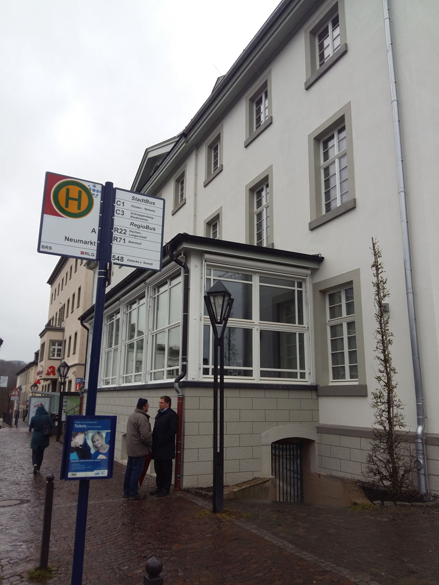 Wäh­rend der Schal­an­der nur abends und vor­aus­sicht­lich nicht an allen Wochen­ta­gen öff­net, sind die „Brau­brü­der“ als Ganz­tags­gas­tro­no­mie geplant und sol­len sie­ben Tage die Woche mit dem Früh­stück star­ten und von 9 bis 24 Uhr geöff­net sein. Denn nicht nur auf dem Neu­markt und Stein­weg, auch im Gebäu­de selbst wird viel Publi­kums­ver­kehr erwar­tet. Bis zu 500 Per­so­nen werk­tags, so schätzt der Betrei­ber. „Alles ist bereits bis unters Dach ver­mie­tet,“ freut sich Eigen­tü­mer Andre­as Ulrich. Ver­kehrs­ver­ein und Hoch­sauer­land­kreis blei­ben als Mie­ter, dazu kom­men eine Haut­arzt­pra­xis und eine Phy­sio­the­ra­pie­pra­xis. Und im Dach­ge­schoss wird eine lang­jäh­ri­ge Bewoh­ne­rin des Hau­ses eine neue gro­ße Woh­nung bekom­men. Ulrich hofft, dass der Gebäu­de­um­bau bis Ende Mai kom­plett über die Büh­ne gegan­gen sein wird. Spä­tes­tens dann wird man das Haus Huse­mann nicht mehr wie­der­erken­nen. Denn vor ihm sei da min­des­tens 50 Jah­re lang nur mit der Uhu-Tube gear­bei­tet wor­den, so der neue Eigen­tü­mer, der eben­so auf­wän­dig wie mög­lichst ori­gi­nal­ge­treu erneuert.