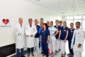 Die Brustschmerzeinheit (Chest Pain Unit, CPU) am Standort St. Walburga-Krankenhaus des Klinikums Hochsauerland ist jetzt erneut von der Deutschen Gesellschaft für Kardiologie (DGK) für die erfolgreiche Umsetzung der strengen Qualitätskriterien für DGK-ausgezeichnete CPUs zertifiziert worden. Der im Hochsauerlandkreis am längsten bestehenden Brustschmerzeinheit wurde damit nach den Kriterien der DGK ein Höchstmaß in der Umsetzung der hohen Standards bei medizinischen Abläufen, Ausstattung und Qualifikation des Fachpersonals bescheinigt. Der Chefarzt der Abteilung, Dr. med. Daniel Gießmann, freut sich mit dem gesamten Team der CPU: „Damit konnten wir nach der Eröffnung der CPU im Jahre 2014 schon zum zweiten Mal in Folge unsere Fachkompetenz und Expertise eindrucksvoll unter Beweis stellen.“