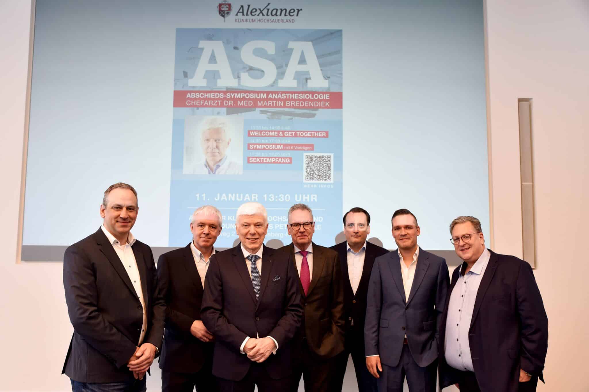 Micha­el Gesen­hues, Geschäfts­füh­rer des Ale­xia­ner Kli­ni­kums Hoch­sauer­land (li.), Dr. Peter Lüt­kes, Medi­zi­ni­scher Direk­tor, Dr. Nor­bert Peters, Ärzt­li­cher Direk­tor und die Chef­ärz­te Dr. Dirk Böse, PD Dr. Kevin Pil­ar­c­zyk, Dr. Cle­mens Keh­ren sowie zahl­rei­che Weg­ge­fähr­ten, Beschäf­tig­te und Gäs­te ver­ab­schie­de­ten Dr. Mar­tin Bre­den­diek (3.v.li) nach über 25-jäh­ri­ger Tätig­keit als Chef­arzt fei­er­lich aus dem Dienst. (Foto: Ale­xia­ner Kli­ni­kum Hochsauerland)