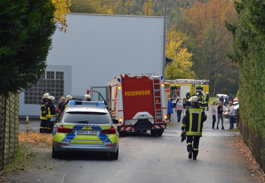 Beim Eintreffen der ersten Einsatzkräfte hatten sämtliche Mitarbeiter die Geschäfts- und Büroräume bereits verlassen. Ein massiver Chlorgeruch wurde sowohl im Betrieb als auch im Freien wahrgenommen. Bei weiterer Erkundung der Umgebung wurde ein Galvanikbetrieb in direkter Nachbarschaft ursächlich für den Chlorgeruch ausgemacht. Daraufhin wurden mehrere Einsatzkräfte der Feuerwehr mit Atemschutzgeräten ausgerüstet, um die Produktionshallen des Galvanikbetriebes zu begehen. Diese erste Maßnahme sollte zum einen neue Erkenntnisse über die Schadenslage geben. Weiterhin sollte mit der Maßnahme ausgeschlossen werden, dass sich keine Mitarbeiter mehr im betroffenen Gebäude aufhielten.