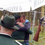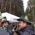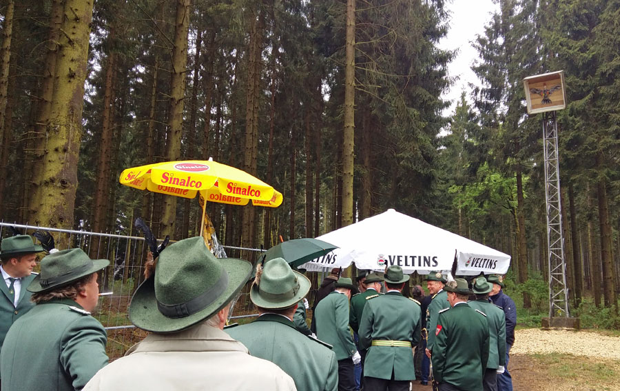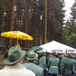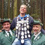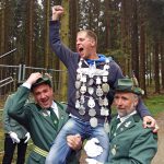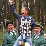 Erst um 11.08 Uhr und nach 155 Schuss war die Entscheidung unter den Fichten gefallen – beides ungewöhnlich für die Schützen aus Kloster Brunnen. So hatte man zunächst das Vogelschießen um eine halbe Stunde verschoben, weil um 9.30 Uhr heftige Regen- und Graupelschauer niedergingen. Während des mehr als einstündigen Schießens blieb es dann trocken und auch die Sonne lugte mehrfach zaghaft hervor. Allerdings war es sehr kalt. Den Kandidaten war es aber wohl eher heiß, denn der Vogel erwies sich als ungewöhnlich zäh. Lange hing der linke Flügel noch senkrecht nach unten, am Ende blieb nur ein schmaler Span rund um die Schraube, der mit einer ganzen Reihe von Treffern zerlegt werden musste.