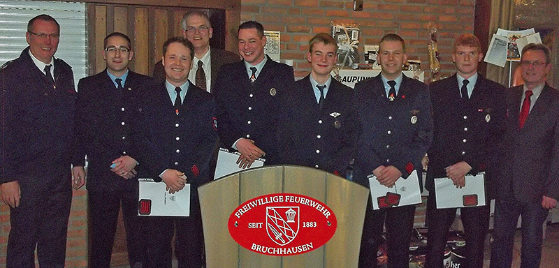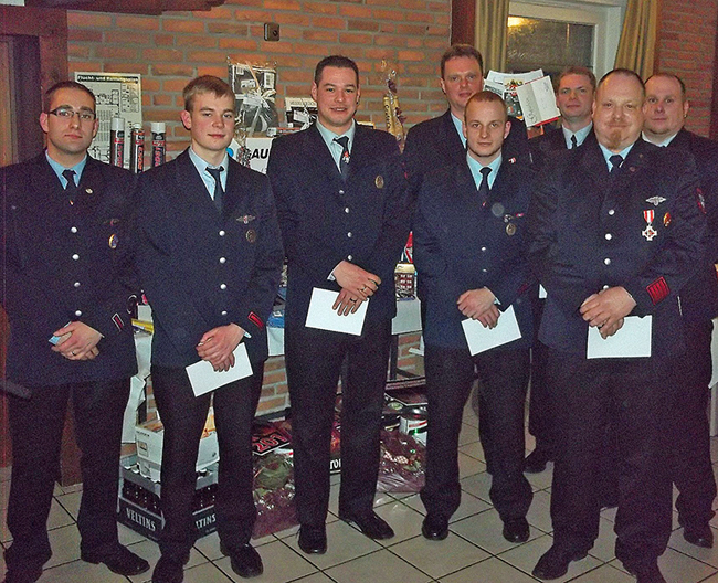 Im feierlichen Rahmen konnten sodann folgende Wehrmänner auf Grund ihrer Leistungen im Feuerwehrdienst befördert werden: Alexander Remarque zum Feuerwehrmann, Daniel Bunsen zum Oberfeuerwehrmann, Dominik Eidens zum Hauptfeuerwehrmann sowie Markus Drews und Jens Tillmann zum Unterbrandmeister. Zudem wurden aus den Reihen der Leistungsgruppe, welche regelmäßig am Feuerwehr-Leistungsnachweis teilnimmt, folgende Einsatzkräfte ausgezeichnet: Raphael Heger, Christoph Voß und Oliver Löhr erhielten für drei erfolgreiche Teilnahmen am Leistungsnachweis das Leistungsabzeichen in Silber. Christian Linke hat bereits zehn Mal an diesem Wettbewerb teilgenommen und erhielt dafür das goldene Leistungsabzeichen auf blauem Grund.