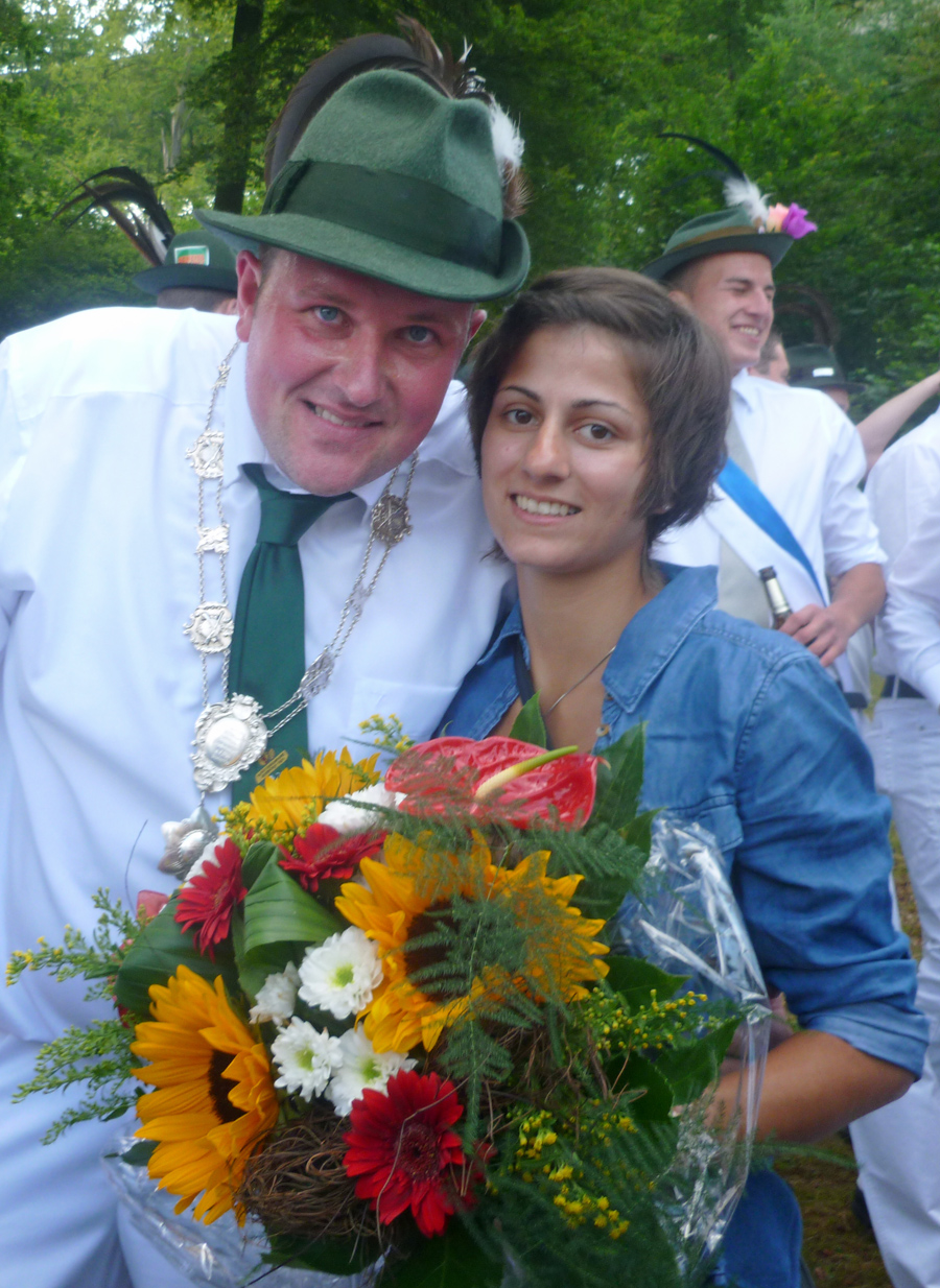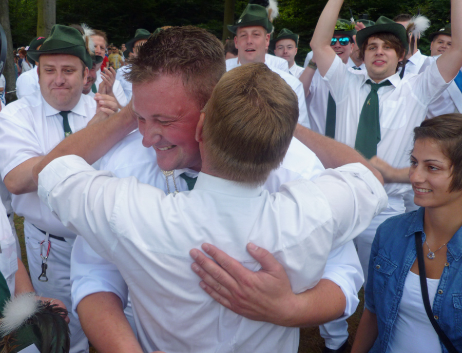 „Den wollte ich dann auch runterholen,“ sagte der neue König, der erstmals als Kandidat unter der Stange stand, zu seinem gut gezielten letzten Schuß. Danny Flinkerbusch ist Ur-Oeventroper und arbeitet als stellv. Marktleiter bei Kaufpark in Arnsberg. Zu Königin wählte er seine 24-jährige Freundin Beriwan Welter, ebenfalls aus Oeventrop und ebenfalls im Einzelhandel tätig. „Am Morgen sei sie noch ganz locker drangegangen“, sagte die freudestrahlende Königin. Den Triumph der Oeventroper Kompanie machte Leon Jaeckel perfekt, der anschließend den Geck abschoss.