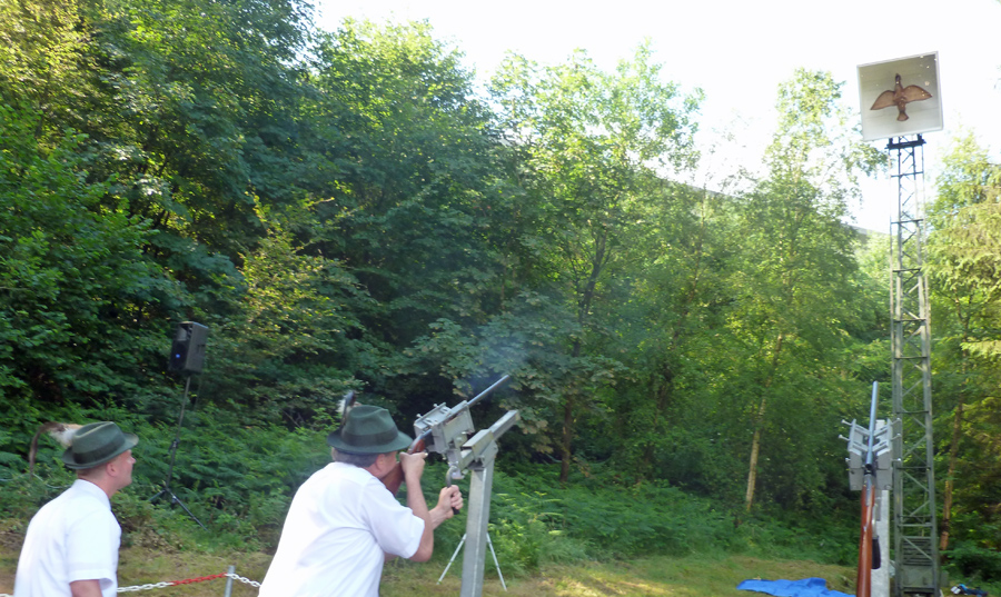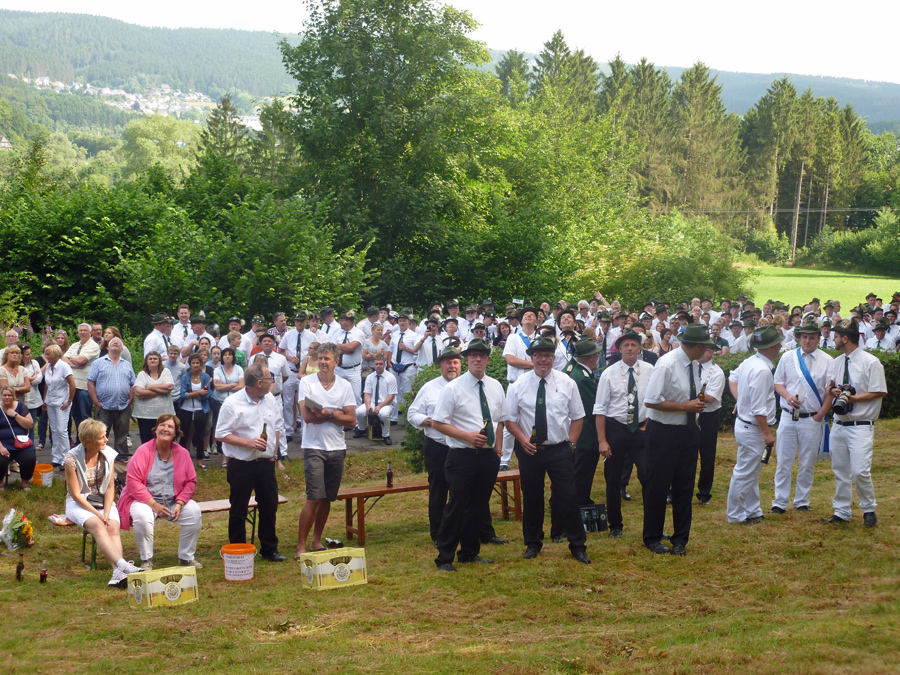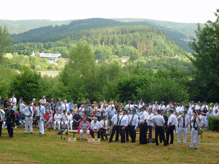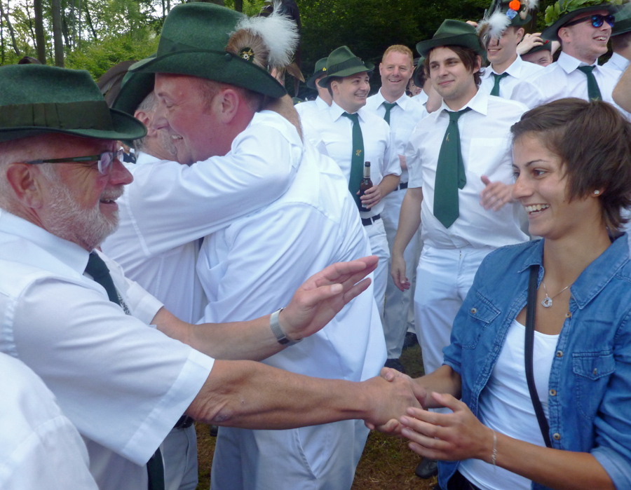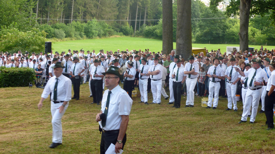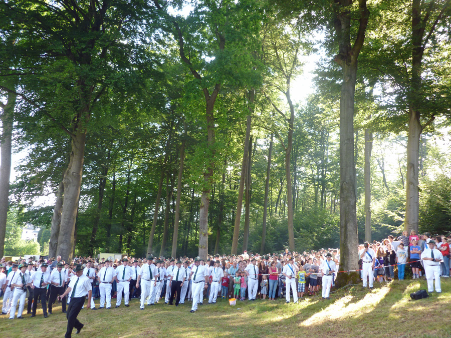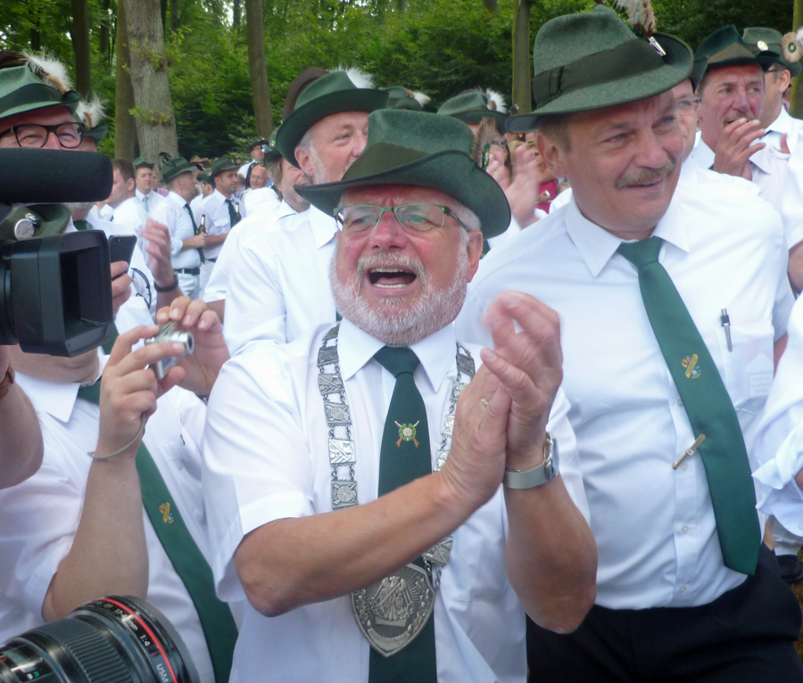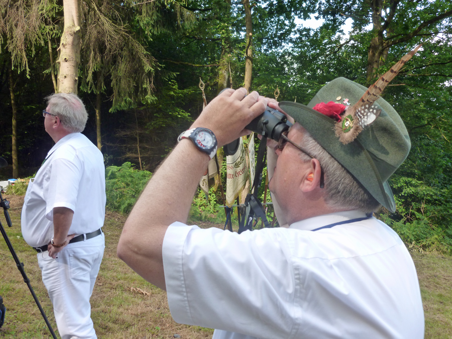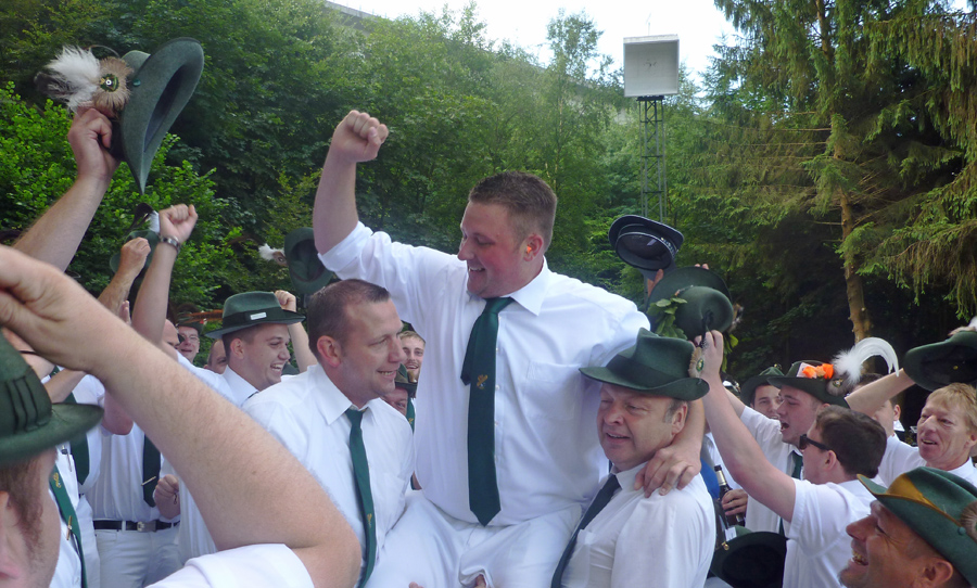 150 Schuss hatte der Vogelbauer seinem Aar gegeben, doch die Schützen aus den drei Ruhrdörfern hatten es eilig trotz der erholsamen Temperaturen unter den Buchen. Nach nur 89 Schuss segelte der Vogel um 10.09 Uhr von der Stange. Insgesamt acht Kandidaten waren angetreten. Die Dinscheder mit Conny Buchheister, Benjamin Bräutigam und Ferdi Geiz sowie die Oeventroper mit Danny Flinkerbusch, Christian Frohwein und Christoph Schmidt verteilten ihr Kompaniekontingent auf je drei Kandidaten. Auch Glösingen hatte drei Kandidaten angemeldet, doch unter der Stange erschienen nur Ingo Wiesehöfer und Josef Berghoff, die sich am Ende damit trösten mussten, dass es beinahe geklappt hätte.