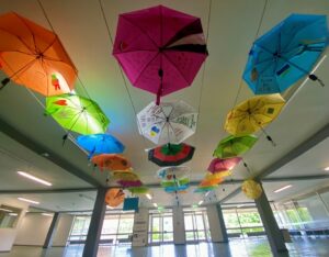 Zum Weltflüchtlingstag am 20. Juni haben Schülerinnen und Schüler verschiedener Klassen des Berufskollegs Meschede, Regenschirme individuell gestaltet. Neben künstlerischen Elementen haben sie auch ihre Wünsche, Ängste und Hoffnungen auf den Schirmen zum Ausdruck gebracht, die nun in der Pausenhalle des BKM aufgespannt sind. Damit wollen die Schülerinnen und Schüler darauf hinweisen, dass allen Menschen Schutz gewährt werden sollte und fordern das Recht auf Asyl und sichere Fluchtwege.