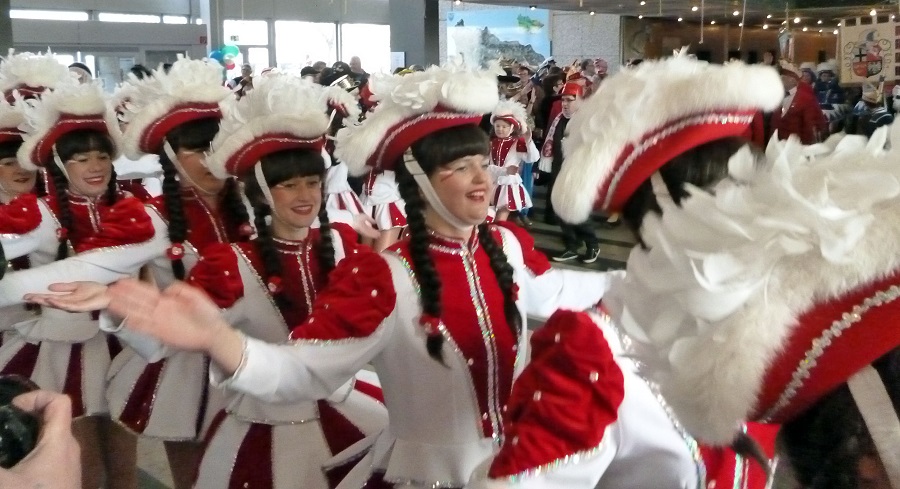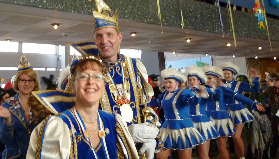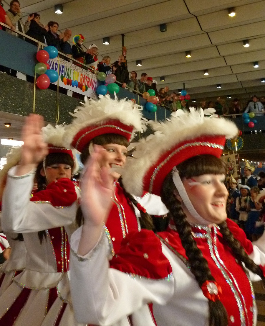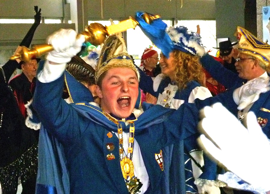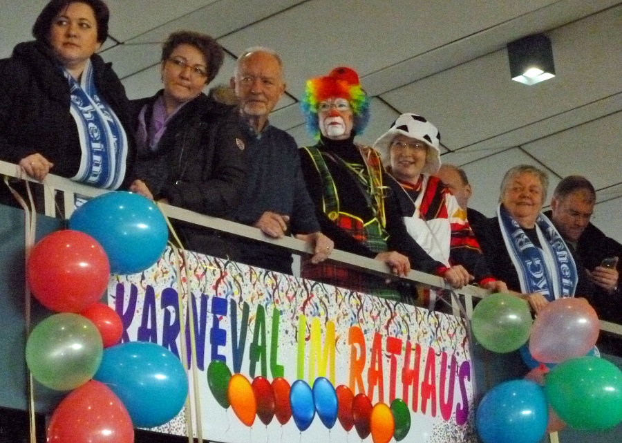Als Stellvertreter des Rathauschefs entschuldigte Bannes den Bürgermeister, den Brüssel gerufen habe. Für alle, die einen Vogel erwartet hatten, hatte sich Bannes sich entsprechend kostümiert, eine Hühnermütze aufgesetzt und zur Sicherheit auch noch ein Schild umgehängt, dass er ein Vogel sei. Im Austausch für den Stadtschlüssel, den Bannes an die drei Karnevalsgesellschaften übergab, hatten diese ein Füllhorn mitgebracht. Gertrud Franke schüttete das Füllhorn mit ganz viel Konfetti unter dem Jubel des zahlreichen Publikums über Kämmerer und Hühnerkostüm aus und wünschte, dass für einige Tage statt der üblichen Sorgen und Probleme Frohsinn und Narretei ins Rathaus einziehen. Anschließend wurden noch die amtierenden Majestäten vorgestellt und sie konnten sich ins Goldene Buch der Stadt eintragen, bevor die Party so richtig losging.