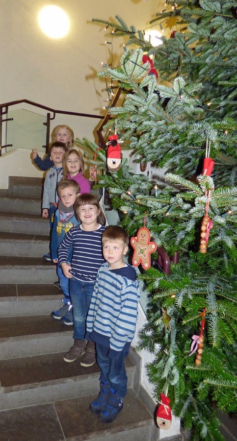 Sundern/Amecke. Die Kinder des Kindergartens “Die Wurzelkinder“ aus Amecke haben fleißig gebastelt. Weihnachtswichtel aus Holz, Kränze aus Haselnüssen und goldene Sterne schmücken jetzt den Weihnachtsbaum im Foyer des Rathauses in Sundern. Pünktlich zum 1. Advent haben die Kinder den Baum zusammen mit Bürgermeister Ralph Brodel dekoriert. Anschließend zeigte der Bürgermeister den Kindern dann noch seinen Arbeitsplatz im Rathaus.