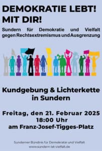 Sundern. Die Bundestagswahl am 23. Februar spaltet das Land. In dieser Zeit möchte das Sunderner Bündnis für Demokratie und Vielfalt die Menschen ermutigen, zur Wahl zu gehen und ihre Stimme abzugeben. Daher ruft das Bündnis zu einer Kundgebung am Freitag, den 21. Februar 2025, um 18:00 Uhr in Sunderns Innenstadt auf. „Die Kundgebung soll dazu beitragen, dem erstarkenden Extremismus in unserem Land entgegenzuwirken. Hass, Populismus und Ignoranz als Grundlage von Politik sind keine Werte, die Frieden, Freiheit und eine gute Zukunft versprechen“, lautet der Appell des Bündnisses in einer Pressemitteilung.