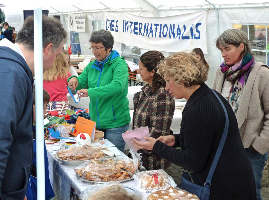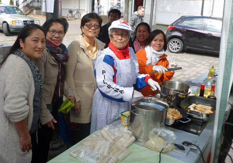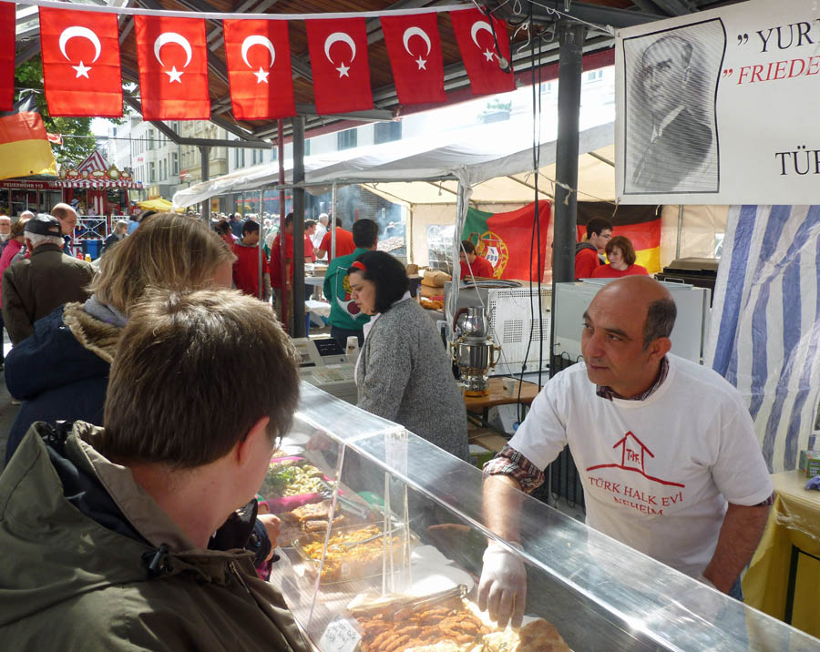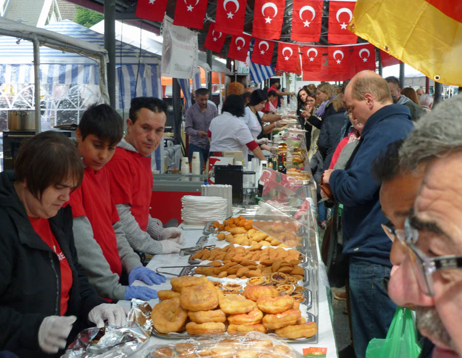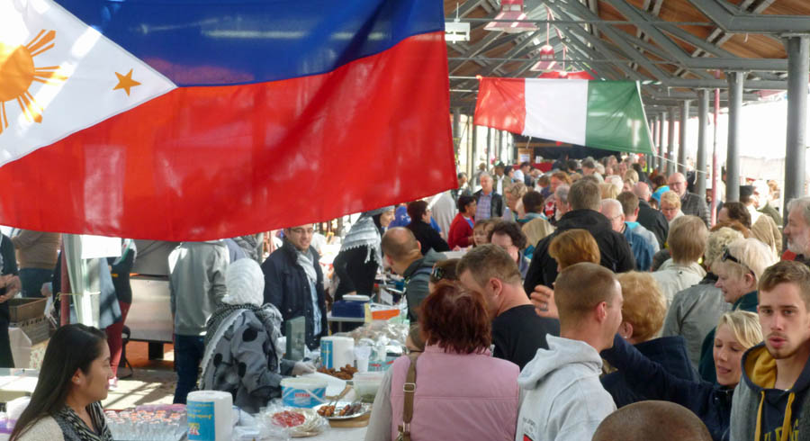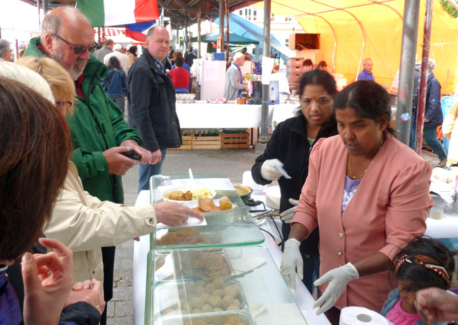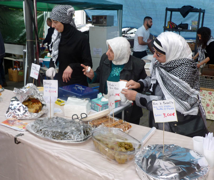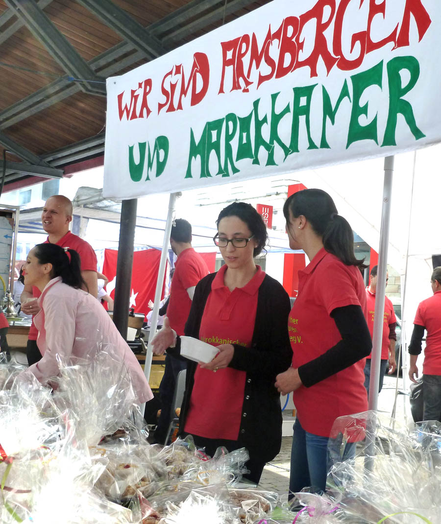 Alle drei Redner wünschten viel Spaß beim bunten Kulturprogramm und guten Appetit. Denn unter den Arkaden gibt es Leckereien aus acht Nationen. Italiener und Portugiesen, Griechen und Türken, Marokkaner und Syrier, Tamilen und Philippinos haben ihre heimischen Spezialitäten aufgebaut. Bereits vor dem traditionellen Friedensgebet um 12 Uhr waren die Stände dicht umlagert.