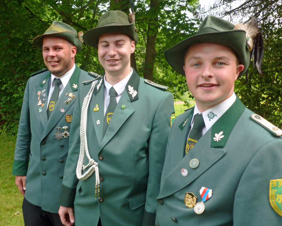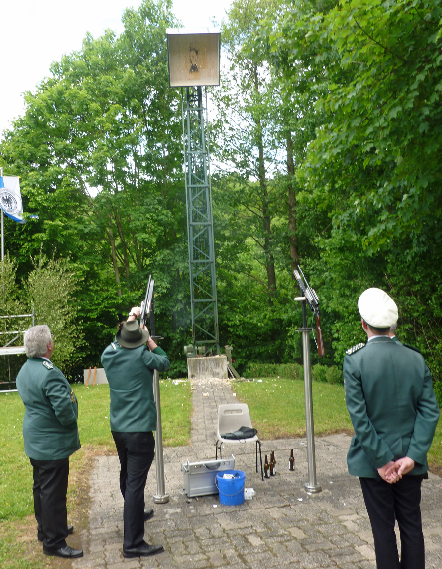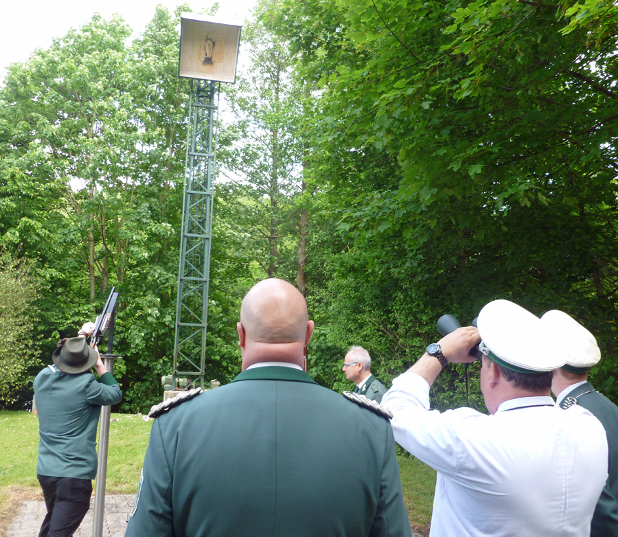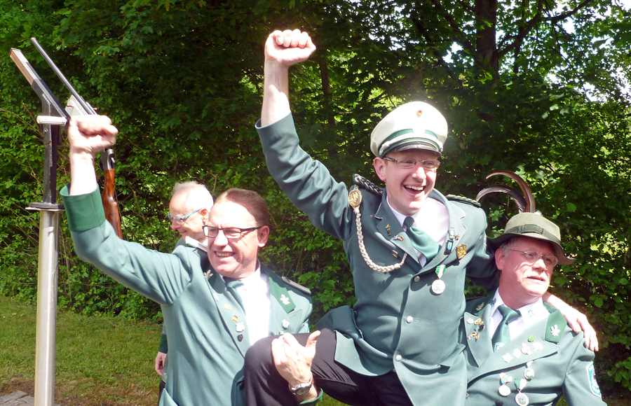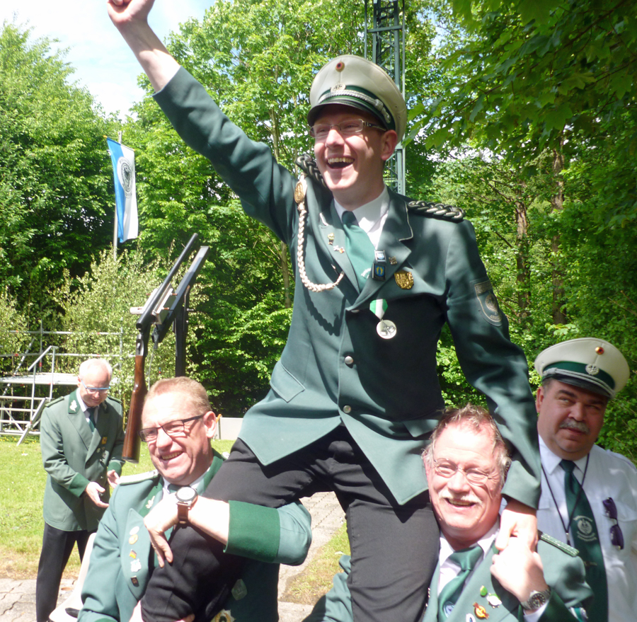 „So schön war das Duell unter der Vogel­stan­ge lan­ge nicht mehr,“ sag­te Micha­el Auf­der­beck, als der Schrep­pen­ber­ger Aar um 12.48 Uhr nach einer gan­zen Serie von Voll­tref­fern im 141. Schuss end­lich von der Stan­ge gefegt wur­de. Der Königs­füh­rer des schei­den­den Mon­ar­chen hat­te sich nach der letz­ten Schieß­pau­se einen auf­re­gen­den Zwei­kampf mit sei­nem an die­sem Tag glück­li­che­ren Kon­tra­hen­ten gelie­fert. Micha­el Auf­der­beck kann sich zumin­dest mit dem Reichs­ap­fel trös­ten. Chris­ti­an Görtz schoss mit Kro­ne und lin­kem Flü­gel gleich zwei Tro­phä­en ab. Der rech­te Flü­gel ging an Rob­by Löbel, das Zep­ter an Manu­el Lit­ver. Des­sen Bru­der Dani­el Lit­ver hat­te sich zuvor als Jung­schüt­zen­kö­nig durch­ge­setzt. Der 23-jäh­ri­ge „Haus- und Hof-Elek­tri­ker“ des Schüt­zen­ver­eins hol­te den unge­wöhn­lich zähen Jung­kö­nigs­vo­gel im 158 Schuß von der Stange.