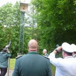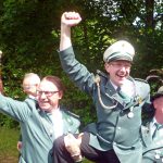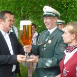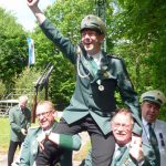 „So schön war das Duell unter der Vogelstange lange nicht mehr,“ sagte Michael Aufderbeck, als der Schreppenberger Aar um 12.48 Uhr nach einer ganzen Serie von Volltreffern im 141. Schuss endlich von der Stange gefegt wurde. Der Königsführer des scheidenden Monarchen hatte sich nach der letzten Schießpause einen aufregenden Zweikampf mit seinem an diesem Tag glücklicheren Kontrahenten geliefert. Michael Aufderbeck kann sich zumindest mit dem Reichsapfel trösten. Christian Görtz schoss mit Krone und linkem Flügel gleich zwei Trophäen ab. Der rechte Flügel ging an Robby Löbel, das Zepter an Manuel Litver. Dessen Bruder Daniel Litver hatte sich zuvor als Jungschützenkönig durchgesetzt. Der 23-jährige „Haus- und Hof-Elektriker“ des Schützenvereins holte den ungewöhnlich zähen Jungkönigsvogel im 158 Schuß von der Stange.