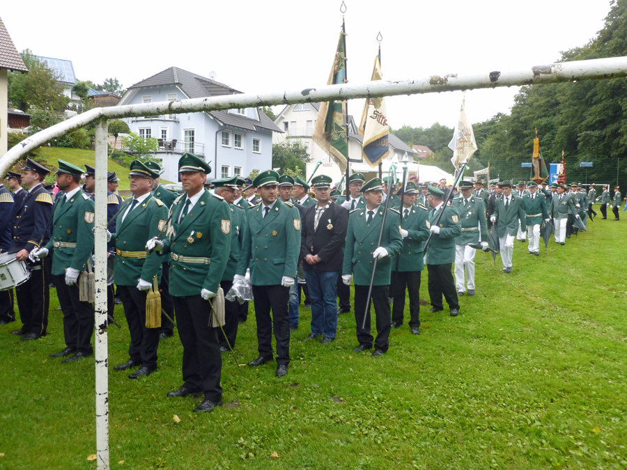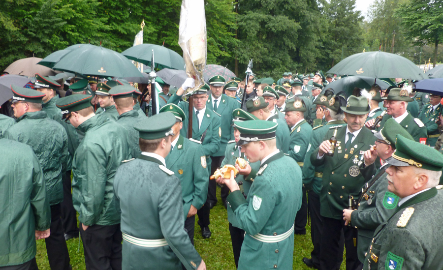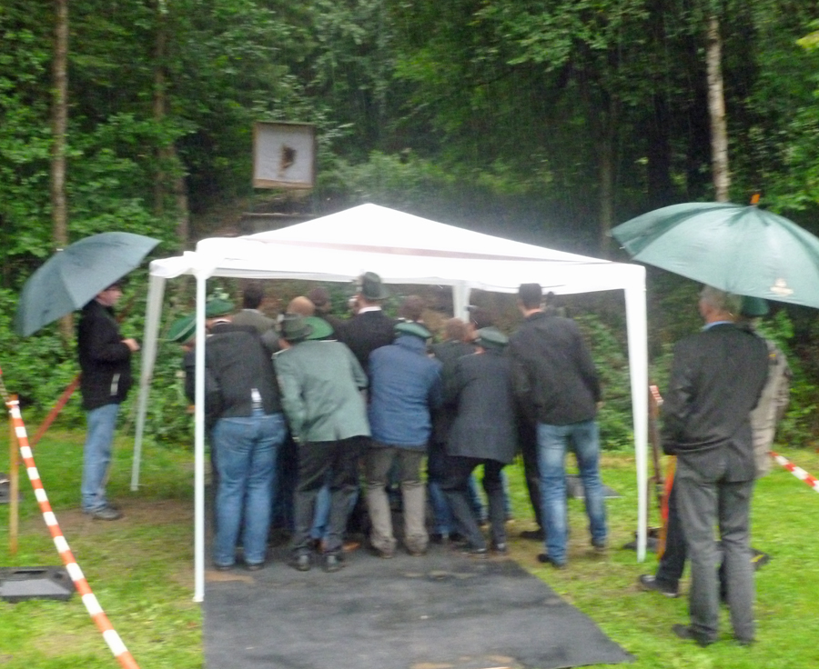 Die Organisatoren hatten nach den Erlebnissen am Vortag beim Jungschützenschießen Vorkehrungen getroffen. Am Freitag hatte der Hachener Jungschützenkönig schon seinen Sieg gefeiert, als gute Augen noch zwei Hölzer von der Rückseite des Vogels an der Schraube entdeckten, die sich farblich nicht von der Fläche des Kugelfangs abhoben. Deshalb hing am Samstag ein weißes Tuch hinter dem Vogel im Kugelfang, um für einen klaren Kontrast zu sorgen. Und so war sofort klar, dass noch weiter geschossen werden musste. Schier endlose Minuten im strömenden Regen folgten. Der Linneper König war es schließlich, der Kandidaten wie Zuschauer aufatmen ließ und den letzten Rest des Vogels von der Stange holte. „Dann machen wir das Jahr mal rund!“, freute sich Daniel Nöcker, bevor er das Küßchen von Königin Marina Eisenhut bekam. Und dann hatten es alle ganz eilig, zurück ins Festzelt zu kommen.