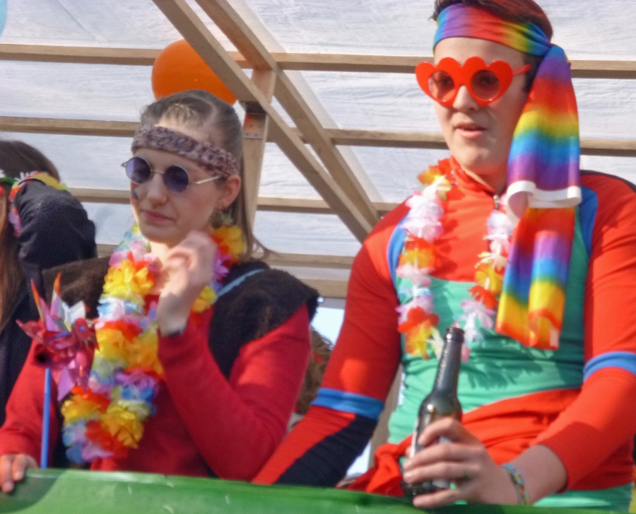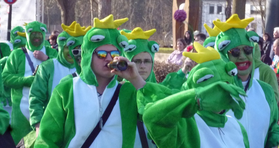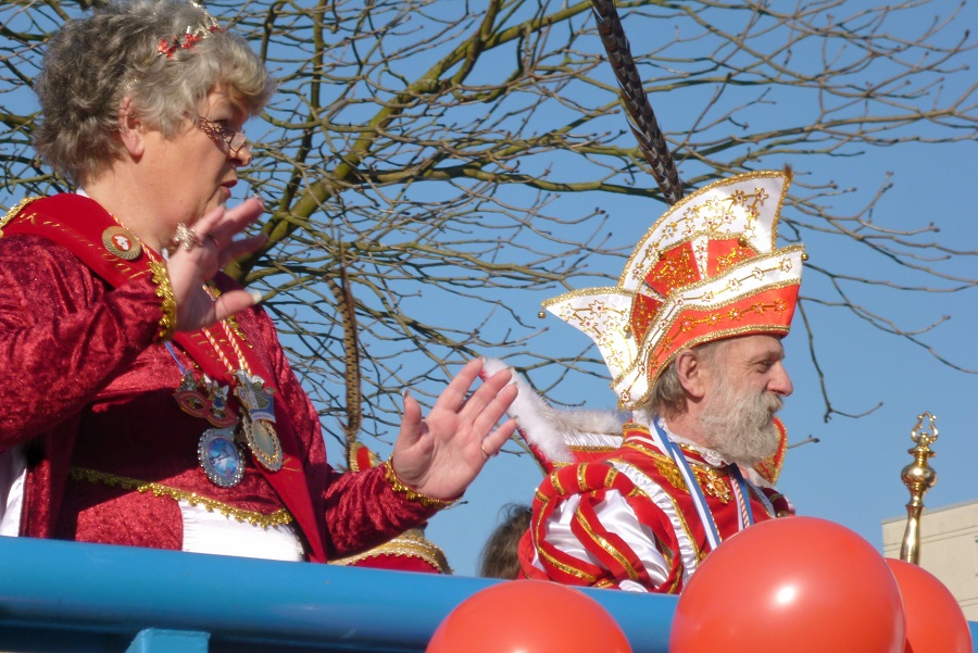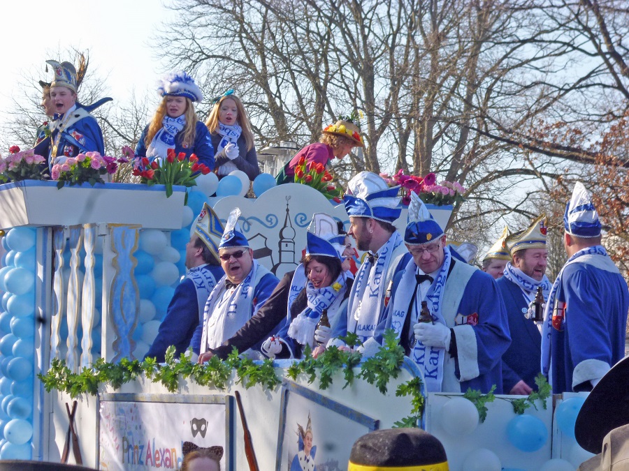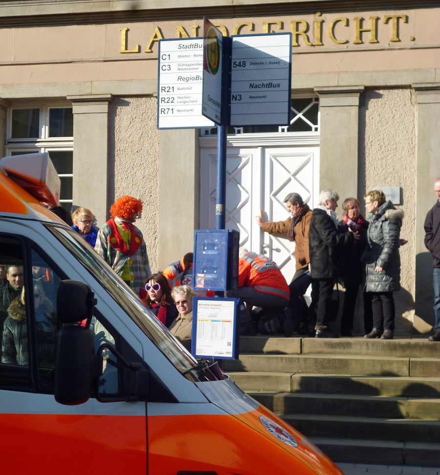 Gegen 14.30 Uhr musste der Zug für eine Viertelstunde stoppen. Auf der Treppe des Landgerichts gab es einen internistischen Notfall. Mit Hilfe des Notarztes kam der Betroffene aber schnell wieder auf die Beine und der Zug setzte seinen Weg durch die engen Spaliere fort. Ganz oben thronte Prinz Alexander, der jecke Schütze. Aber auch das Arnsberger Kinderprinzenpaar, das Hüstener Prinzenpaar und die Neheimer Kinderprinzessin sowie viele ehemalige Regenten ließen sich feiern. Grund zum Feiern hatte auch der Freundeskreis V. Kompanie, der mit seiner 22. Zugteilnahme ein karnevalistisches Jubiläum feierte. Mit rund 50 grünkostümierten Fröschen forderte die Fünfte, die Krötenwanderung in den Onlinehandel zu stoppen. Optimismus, dass es mit dem Patienten Arnsberg wieder aufwärts geht, zeigten die Ärzte und Schwestern von „Wir in Arnsberg“. Mit großen Gruppen erinnerten der TVA an den Bau seines Sportzentrums und der Kneippverein an das Team Arnsberg/Storchennest. Ihre zehnte Zugteilnahme feierten die Königspaare im Kommerskreis mit Barockkostümen. Der Caritasverband zeigte sich mit einer großen Gruppe „bunt wie eine Blumenwiese“. Aus Niedereimer kam die Affenbande und aus Uentrop erstmals die Prinzengarde. Die Heiligkreuz-Gemeinde machte die Kulturstadt Arnsberg zum Broadway und der Cocktailclub Muffrika die Wennigloherstraße zur Sesamstraße. Hofstaat und Blasorchester der Bürgerschützen, Jugendrotkreuz und Gymnasium Laurentianum, bunte Pfauenpower von „Nie komplett“ und Maskenmagie von Blauweiß Neheim, die Arnsberger Grünen mit einem Plädoyer für ein buntes Arnsberg und Vielfalt in der Stadt und noch manche mehr sorgten für ein ebenso farbenprächtigen wie unterhaltsamen Zug. das Publikum jedenfalls hatte seine Freude und feierte noch lange in den Kneipen weiter.