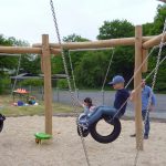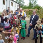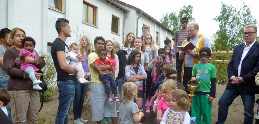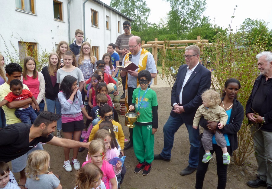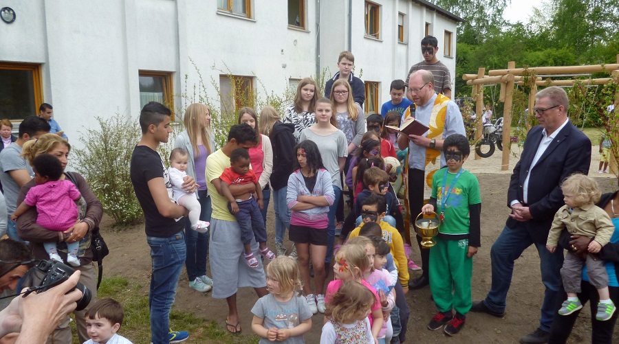 „Freude bereiten für die gesamte Menschheitsfamilie“ nannte auch Pfarrer Dietmar Röttger als Ziel, als er den Spielplatz segnete. Zuvor hatte Fachbereichsleiter Helmut Melchert in Vertretung des Bürgermeisters betont, dass die Hüstener Kirchengemeinde hier ein richtiges und wichtiges Zeichen für die Integration gesetzt habe. Denn Integration brauche auch Geld, vor allem aber Menschen, die Patenschaften übernehmen und Kontakte schaffen. Melchert kündigte auch an, dass die neue Flüchtlingsunterkunft im Rumbecker Holz in etwa sechs Wochen die ersten Bewohner aufnehmen werde. Er hoffe, dass dann auch die Kinder von dort den kurzen Weg zu diesem Spielplatz finden werden. Es gebe allerdings auch schon eine Initiative der St. Johannes-Gemeinde, die eine Partnerschaft für die Flüchtlingsunterkunft im Rumbecker Holz übernehmen möchte und möglicherweise dort ebenfalls mit Paderborner Hilfe einen Spielplatz errichten könnte.