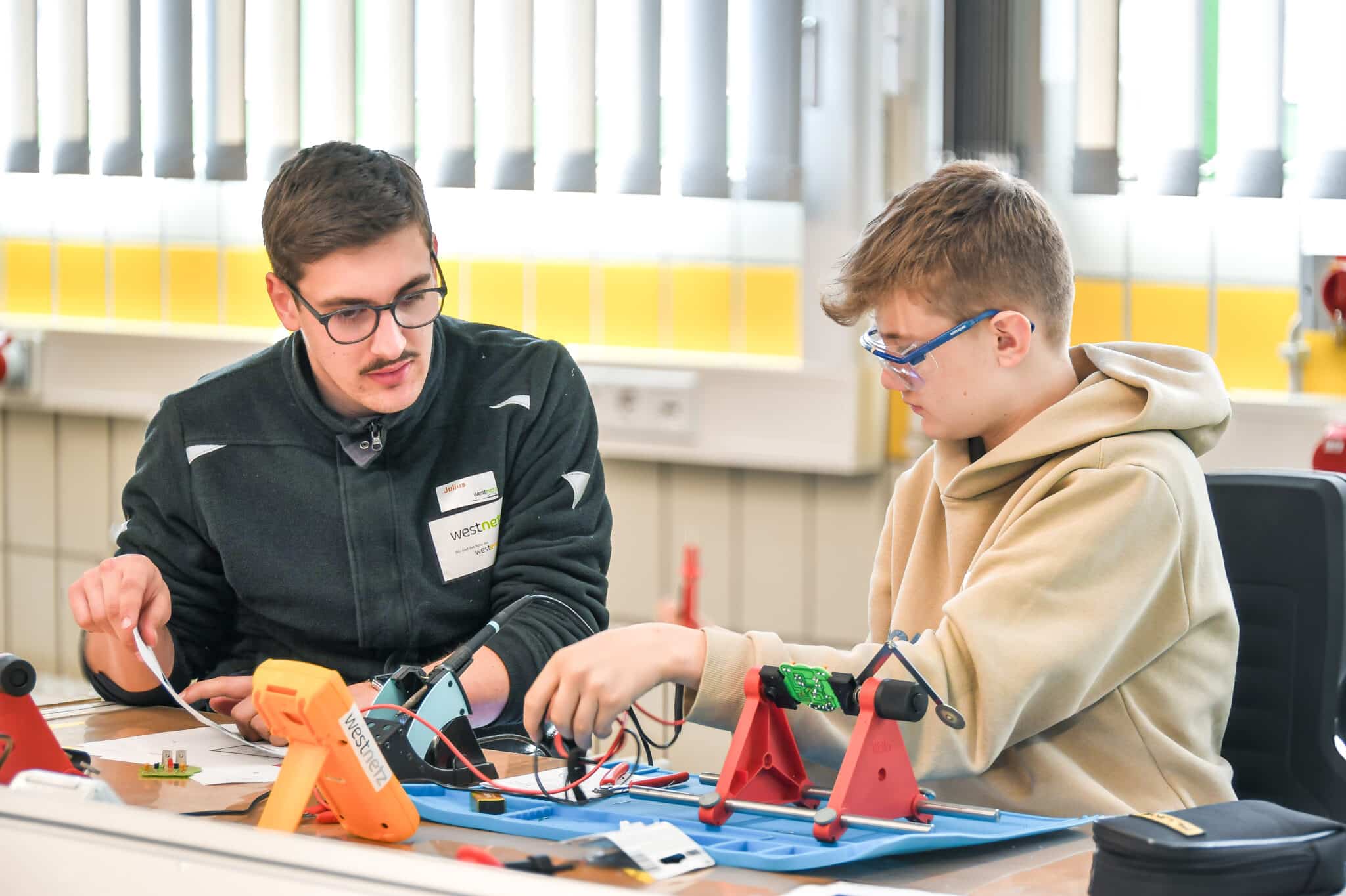 Zur Einführung lernten die jungen Menschen im Ausbildungszentrum zuerst das Unternehmen und anschließend die Tätigkeiten der Elektronikerin bzw. des Elektronikers für Betriebstechnik kennen. Unter Anleitung der Auszubildenden probierten sich die Teilnehmenden selbst aus. So führten sie beispielsweise Lötübungen durch, verdrahteten eine Ausschaltung und lernten, wie eine Muffe montiert wird.