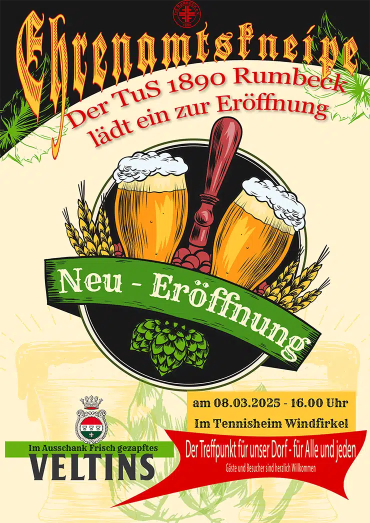 „Sei es auf einenKü Kaffee, ein Bierchen oder ein anderes Kaltgetränk. In der Vergangenheit war das Tennisheim ein gerne besuchter Ort für viele aus dem Dorf. Der Begriff “Dorf” steht für uns für Zusammenarbeit, Gemeinschaft und Zusammenhalt. Hierzu möchten wir mit der Ehrenamtskneipe einladen, um genau diese Aspekte auszuleben und zu fördern.“