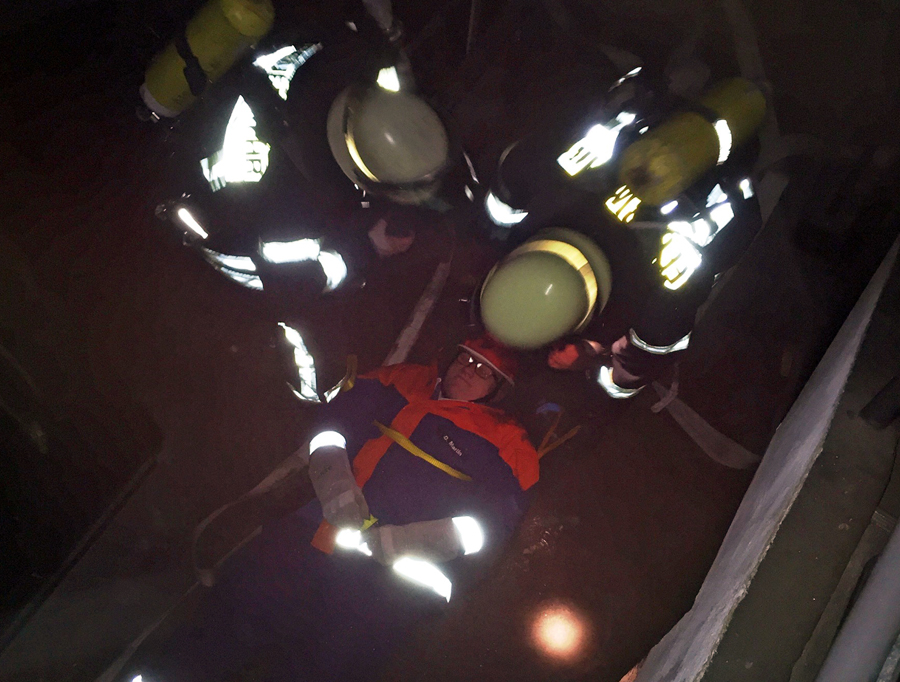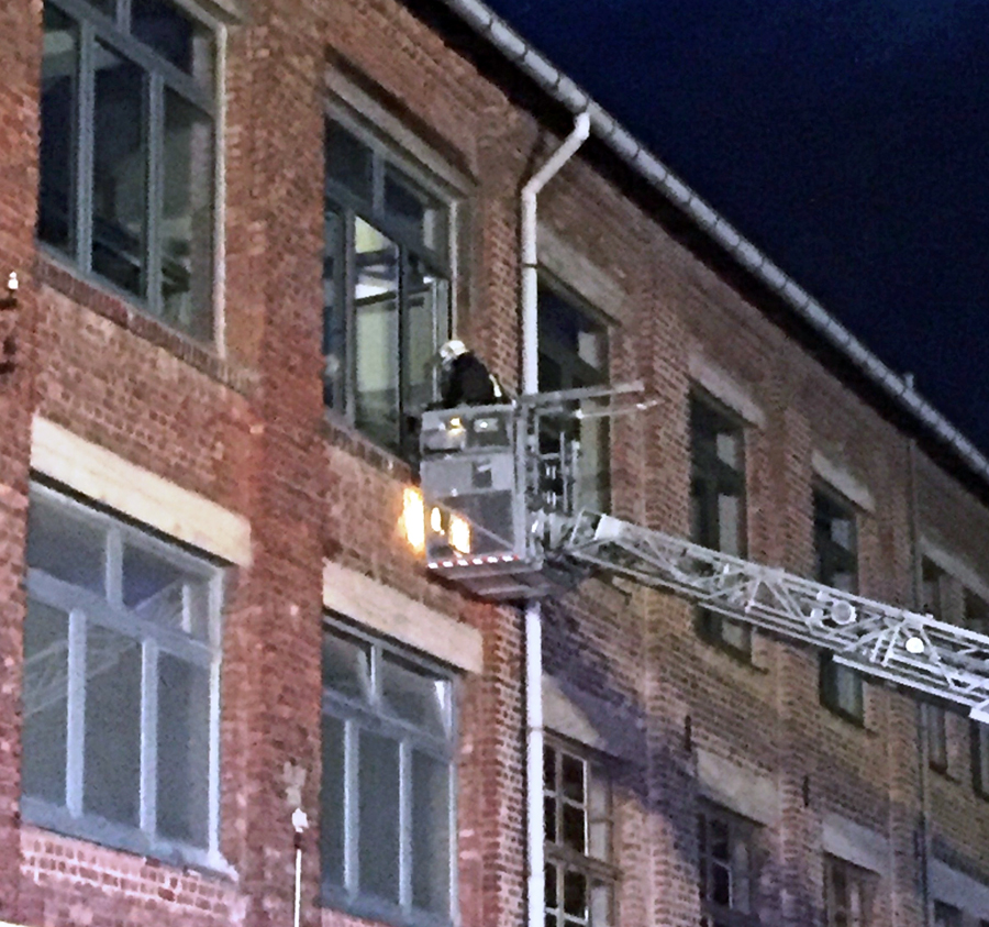 Ange­nom­men wur­de ein Brand mit ver­miss­ten Per­so­nen. Beim Ein­tref­fen der ers­ten Ret­tungs­kräf­te am Übungs­ort mach­ten sich bereits zwei Per­so­nen an einem Fens­ter im zwei­ten Ober­ge­schoss bemerk­bar. Es quoll zudem Qualm aus der Fens­ter­öff­nung. Der Ein­satz­lei­ter nahm Kon­takt mit den bei­den Per­so­nen auf, um wich­ti­ge Infor­ma­tio­nen zum Umfang des Bran­des zu erlan­gen. Nach der Erkun­dung erhielt der ers­te Angriffs­trupp den Befehl, zur Men­schen­ret­tung vor­zu­ge­hen, aus­ge­rüs­tet mit einem C‑Rohr, einem mobi­len Rauch­ver­schluss und wei­te­rem Ret­tungs­ge­rät. Hier­bei wur­de der Trupp von einem wei­te­ren Ein­satz­trupp unter schwe­rem Atem­schutz unter­stützt. Der ers­te Trupp muss­te mit Hil­fe tech­ni­scher Spe­zi­al­aus­rüs­tung eine Stahl­tür öff­nen, die ihm den wei­te­ren Weg ver­sperr­te. Mit ver­ein­ten Kräf­ten gelang es schließ­lich, die Tür zu öff­nen, den Rauch­ver­schluss anzu­brin­gen und die Suche im drit­ten Ober­ge­schoss fort­zu­füh­ren. Die wei­te­ren Ein­satz­kräf­te mach­ten sich von außen mit Hil­fe der Dreh­lei­ter und einer vier­tei­li­gen Steck­lei­ter an die Befrei­ung der zwei Personen.