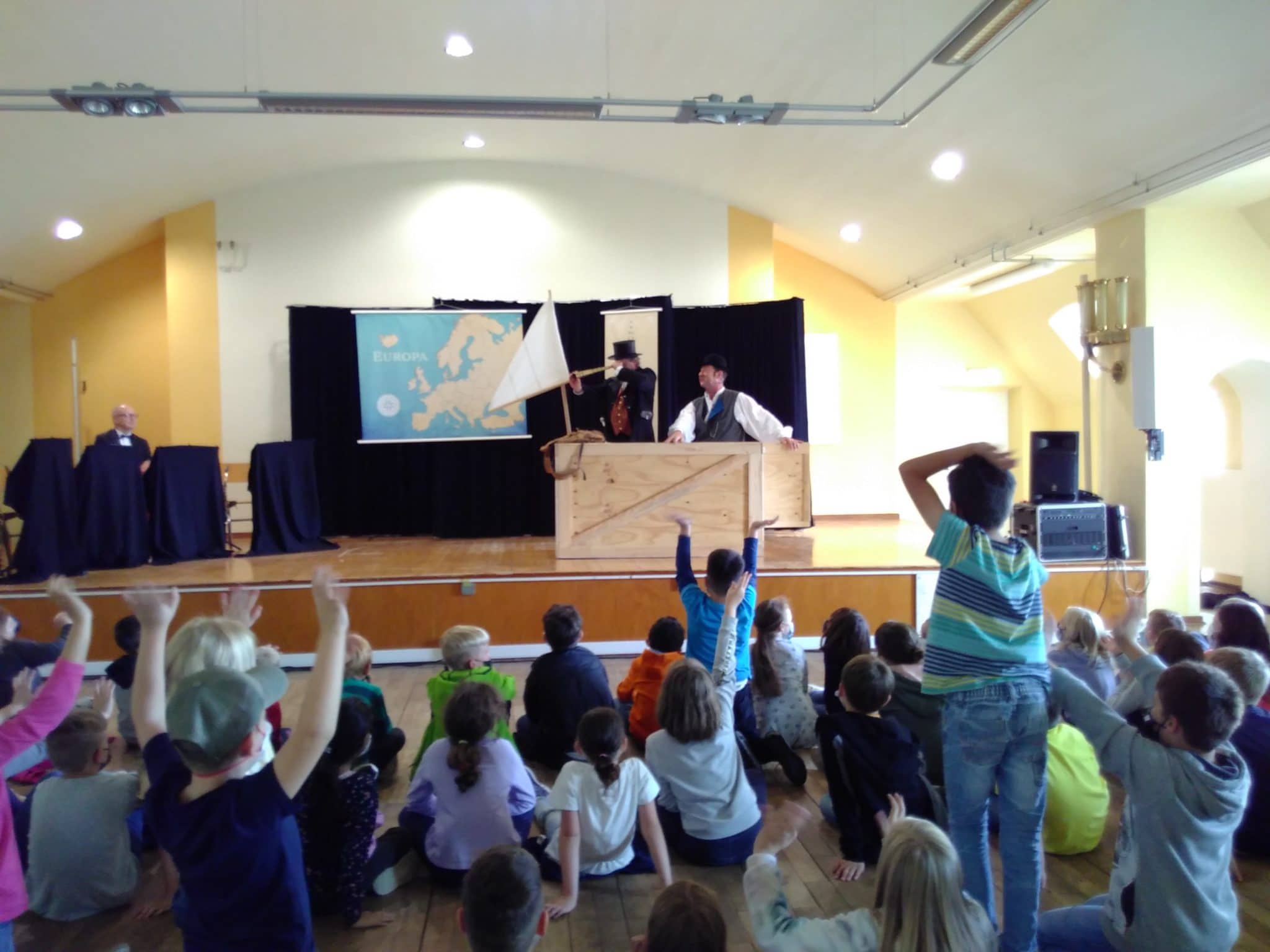 Gemeinsam mit den Musikern des Pindakaas Saxophon Quartetts gehen Mister Fogg und Monsieur Passpartout auf eine rasante Abenteuerreise durch den Kontinent und die SchülerInnen erlebten was Europa so einzigartig und vielfältig macht. Die großartige Musik und das perfekte Schauspiel verwandelte die Bühne, nur mit einer Holzkiste ausgestattet, in die vielen Länder Europas. Große Freude kam bei manchen Kindern auf, wenn deren Eltern oder Großeltern aus dem jeweils bereisten Land kamen.