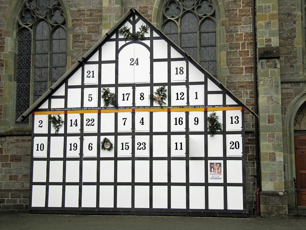 Enkhausen. Der im Abstand von drei Jahren mit viel Liebe zum Detail aufgebaute Enker Weihnachtsmarkt lädt am ersten Adventswochenende „Rund um die Laurentiuskirche“ ein. Die über die Region Sunderns hinaus anerkannte und viel beachtete vorweihnachtliche Veranstaltung wird nun schon zum 5. Mal durchgeführt. Engagierte Enkhauser wollen ihren Besuchern wieder ein stimmungsvolles Erlebnis bieten. Absoluter Blickfang ist in diesem Jahr der vor der Kirche aufgebaute größte Adventskalender des Sauerlandes. Hinter seinen 24 „Kläppchen“ verbergen sich wertvolle Geschenke, die am ersten Adventssonntag im Rahmen einer Tombola zugunsten caritativer Zwecken verlost werden.