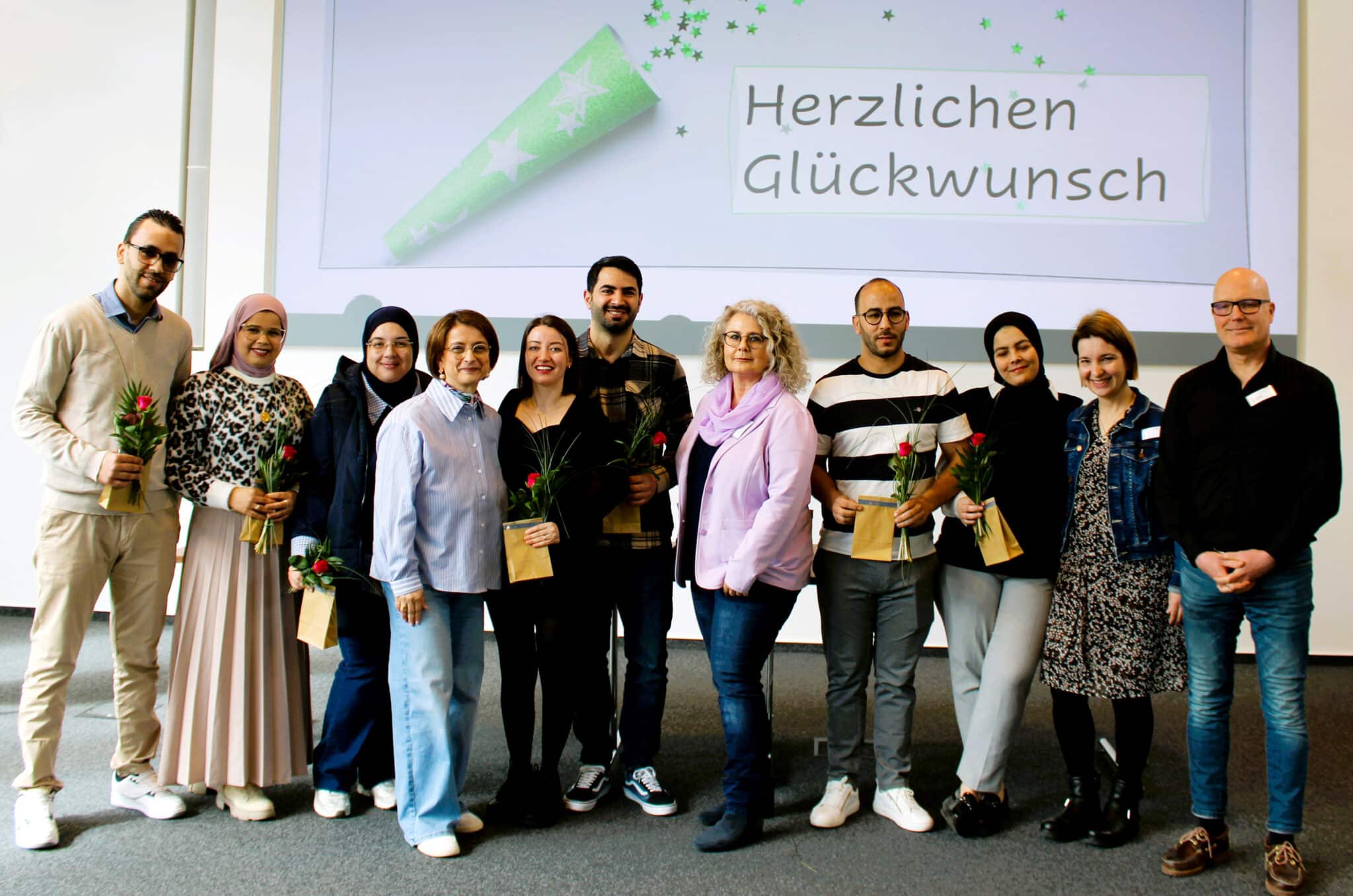 Kursleitern sowie der Integrationskoordinatorin über den erfolgreichen Abschluss, mit dem sie auch die Anerkennung zur Pflegefachfrau bzw. zum Pflegefachmann erworben haben. (Foto: Alexianer Klinikum Hochsauerland)