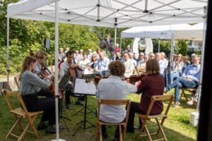 Sundern/Stockum. Der Kulturring Sundern und der Verein der Freunde und Förderer der Akademie für Kunst und Kultur, Berghaus Stockum haben eine neue Ebene der Zusammenarbeit entwickelt. Schon seit längerer Zeit unterstützten sich die Vereine gerne gegenseitig. Doch am 25. August fand zum ersten Mal eine Kooperation auf Veranstaltungsebene statt. Der Kulturring bat im neu gestalteten Berghausgarten zur „Matinee im Grünen“. Die eigentlich angesagte Gruppe UWAGA war zwar Corona-bedingt ausgefallen, doch schnell fand Benedikt Ter Braak ein hochkarätiges Ensemble, das im Berghausgarten brillierte: Frederick Winterson, Veronica Miecznikowaki, Valentin Ungureanu, Rica Schultes, Stefano Cucuzzella bilden das „Klangraum-Ensemble“ aus Köln. Standing Ovationen zeigten den Musikern, wie gut sie beim Publikum ankamen. Mit Begeisterung wurden von den Zuhörern mehrere Zugaben verlang.